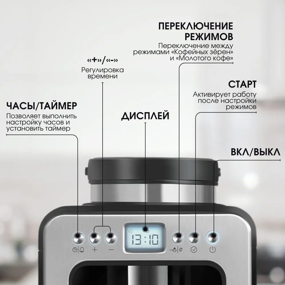 Конструкция кофеварок/кофемашин: Противокапельная система, Индикатор уровня воды, Дисплей, Фильтр от накипи