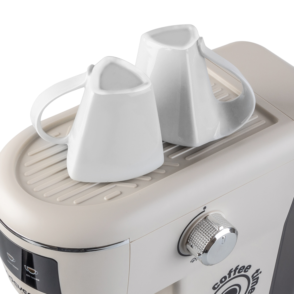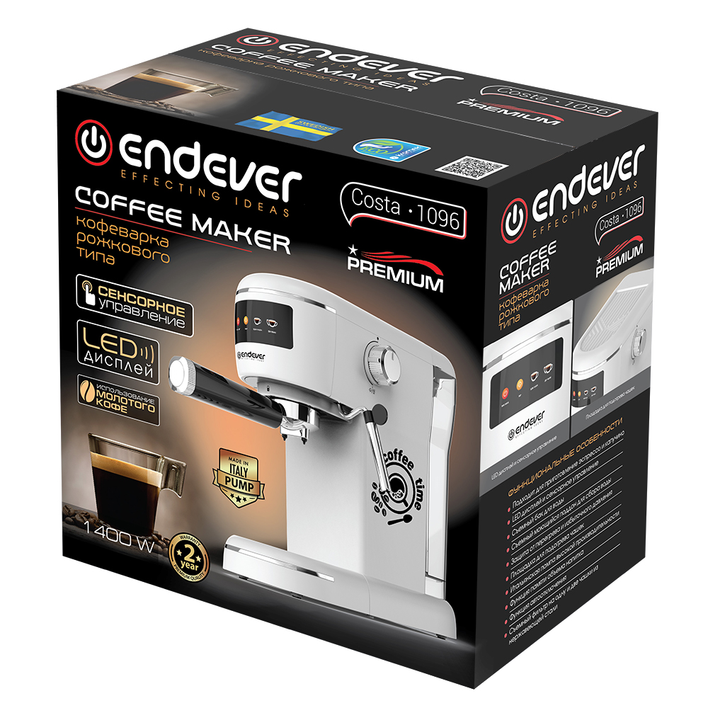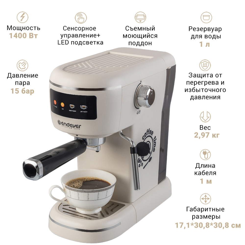 Тип используемого кофе: молотый, LED подсветка и сенсорное управление, Съемный бак для воды, Съемный моющийся поддон для сбора воды, Защита от перегрева и избыточного давления, Площадка для подогрева чашек, Итальянская помпа высокой производительности, Функция памяти объема напитка, Функция автоотключения, Съемный фильтр на одну и две чашки из нержавеющей стали, Подходит для приготовление эспрессо и капучино