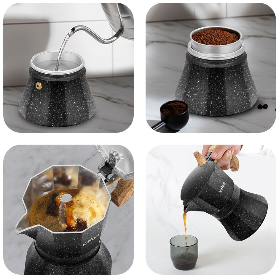 Гейзерная кофеварка рассчитана на приготовление определенного количества чашек кофе. Например, модель КТ-7587 вмещает 20 граммов кофе и 150 миллилитров воды. Этого достаточно для создания трёх порций по 40 миллилитров каждая.