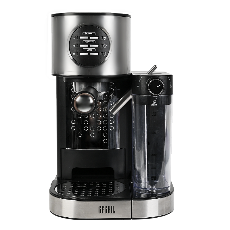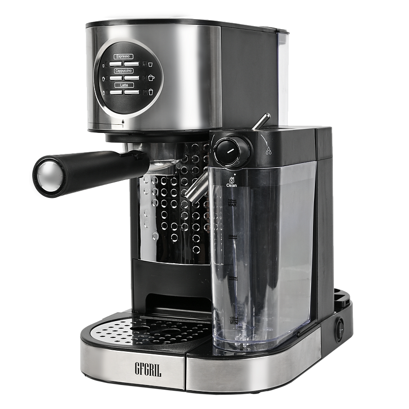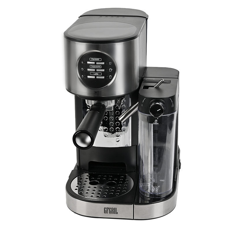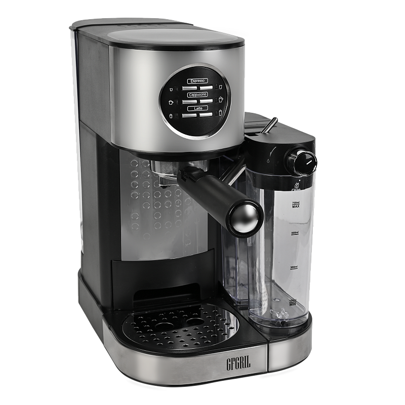 Кофеварка для капучино имеет резервуара для воды объемом 1,2 литра - это обеспечивает компактный размер прибора 21,5*31,5*33,0 см, благодаря чему кофеварка не займет много места на кухне. Кофеварка рожкового типа GFGRIL GFC-A300 имеет съемный резервуар для воды со шкалой уровня воды, а также съемный резервуар для молока объёмом 0,7 л, который можно хранить в холодильнике (BPA-free). Поддон для сбора капель со съёмной решёткой легко снимается, моется и устанавливается обратно. Встроенная защита от перегрева и избыточного давления и режим энергосбережения делают кофеварку более безопасный и энергоэффективной. Также есть режим очистки от накипи.