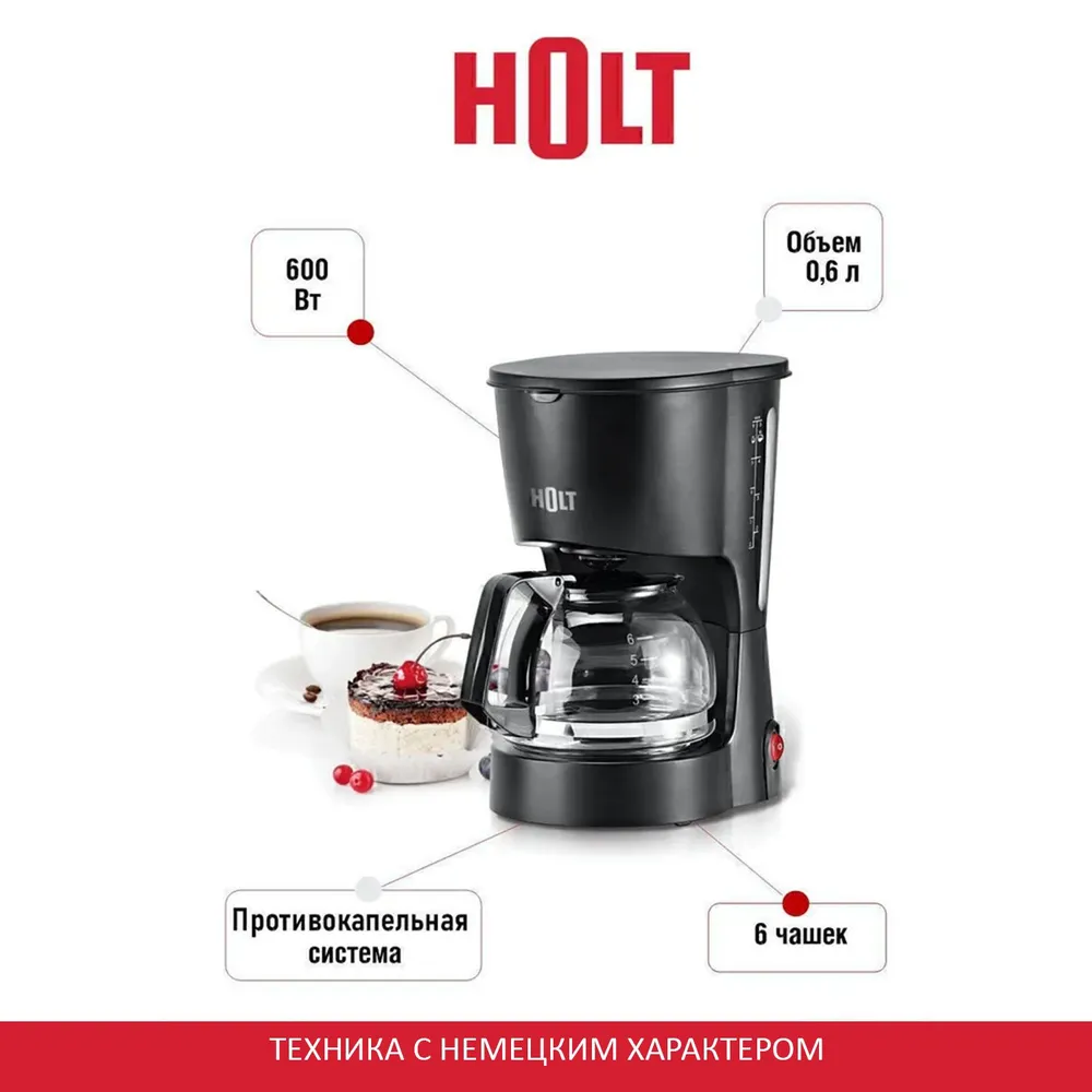 Электрическая кофеварка Holt HT-CM-005 варит великолепный кофе из молотых кофейных зерен. Современный дизайн черного корпуса приятно вписывается в большинство современных интерьеров. Кувшин из термостойкого стекла сохранит вкус кофе, а функция поддержания температуры не даст остыть