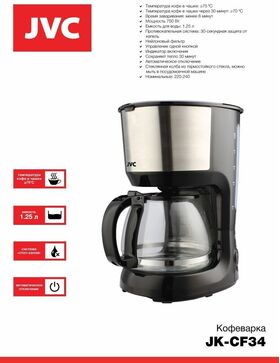 Комплектация товара Кофеварка JVC JK-CF34 капельного типа зависит от конкретной поставки и может меняться поставщиком без предварительного уведомления!