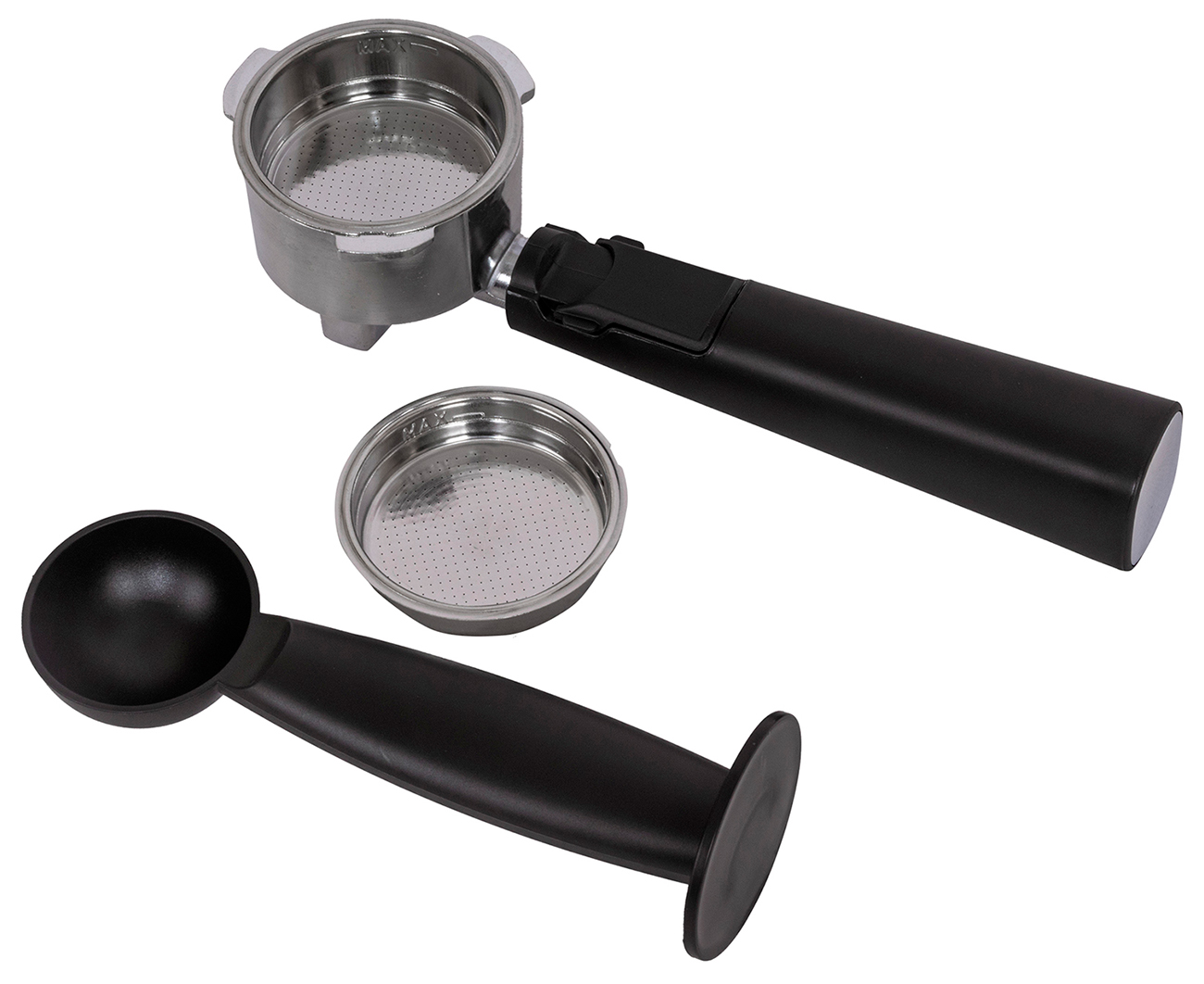 Кофеварка, съемный резервуар для воды, насадка капучинатор, алюминиевый рожок, два сетчатых фильтра, мерная ложка с темпером, инструкция на русском языке