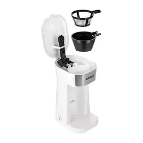 В кофеварке горячая вода медленно поступает в фильтр с молотым кофе. Многоразовым фильтром можно пользоваться любое количество раз. Сетка фильтра изготовлена из нейлона. Фильтр вмещает 15 грамм молотого кофе, а резервуар для воды имеет емкость 400 мл.