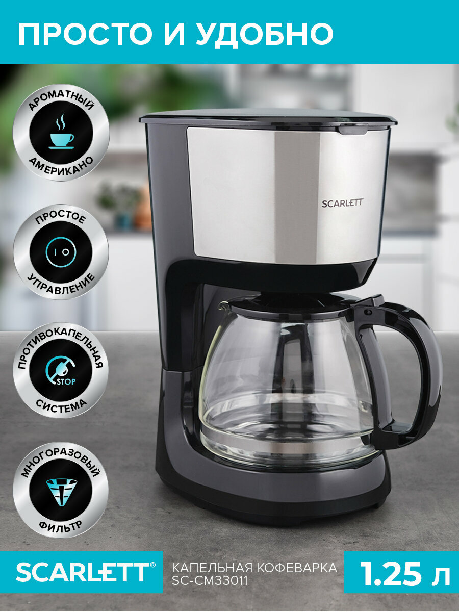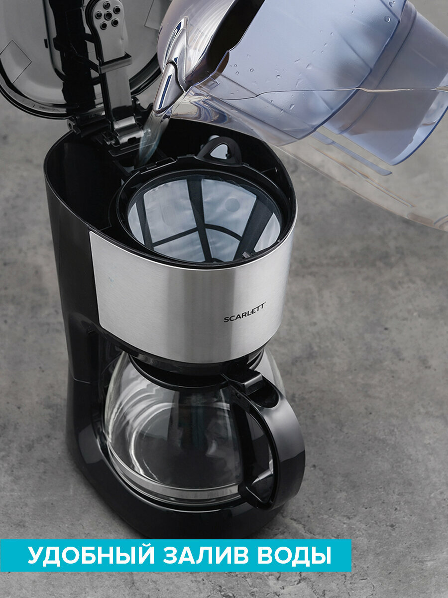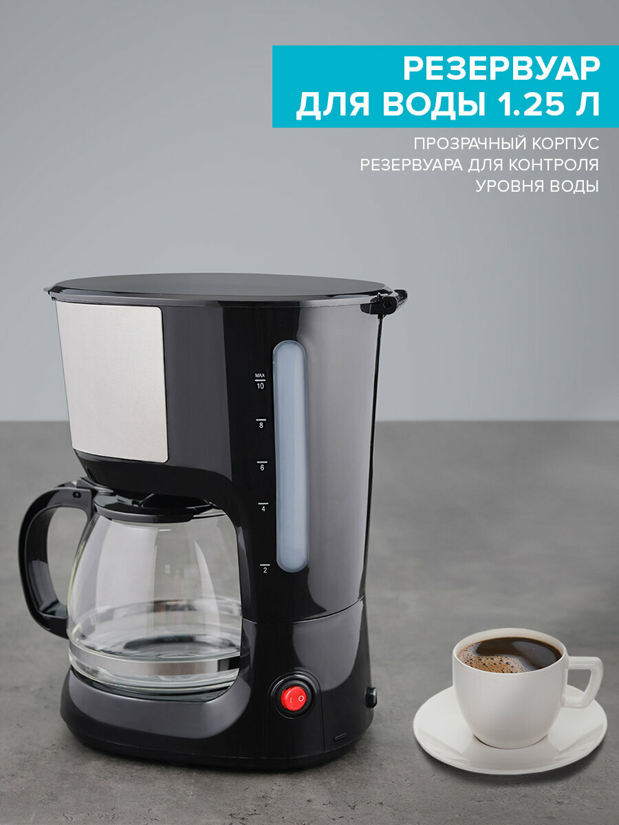 Увеличенный объем кофейника 1.25 л рассчитан на приготовление 4-6 чашек кофе.