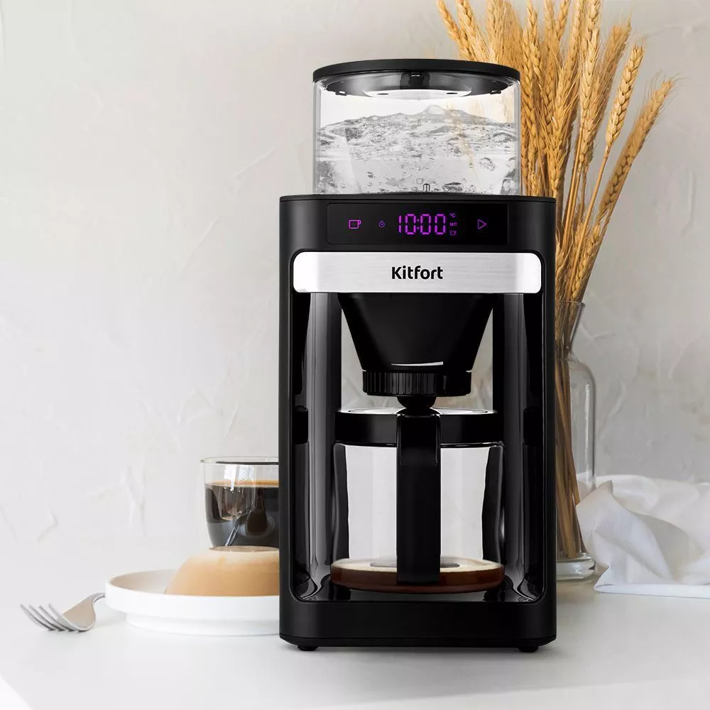 Управление осуществляется при помощи двух кнопок на панели управления. Также кофеварка оснащена дисплеем. На нём отображается текущая температура воды в резервуаре, количество воды, подаваемой в фильтр, и время таймера подогрева.