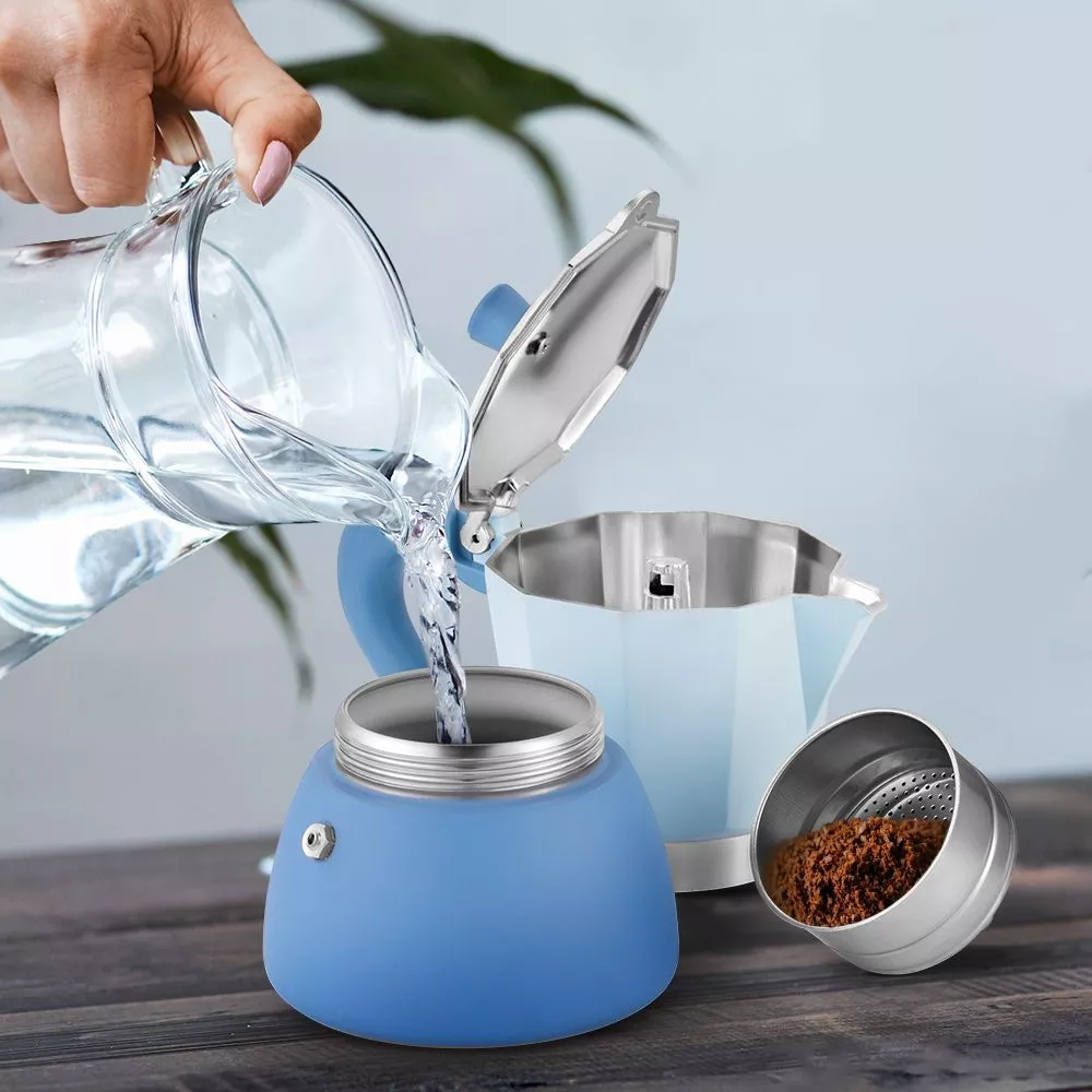 В резервуар наливают воду и устанавливают воронку с фильтром, куда добавляют молотый кофе. Сверху накручивается резервуар для кофе. Далее кофеварку помещают на плиту. Вода нагревается, пар вытесняет горячую воду через фильтр, и получается вкусный кофе!