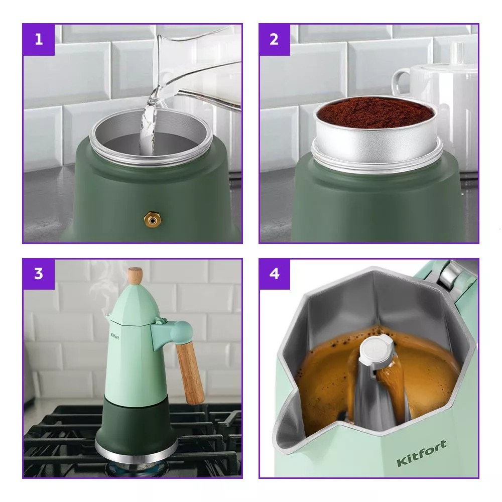 Гейзерная кофеварка КТ-7154 подходит для использования на газовых, электрических и инфракрасных плитах. Рекомендуется включать плиту на среднюю мощность при заваривании кофе.
