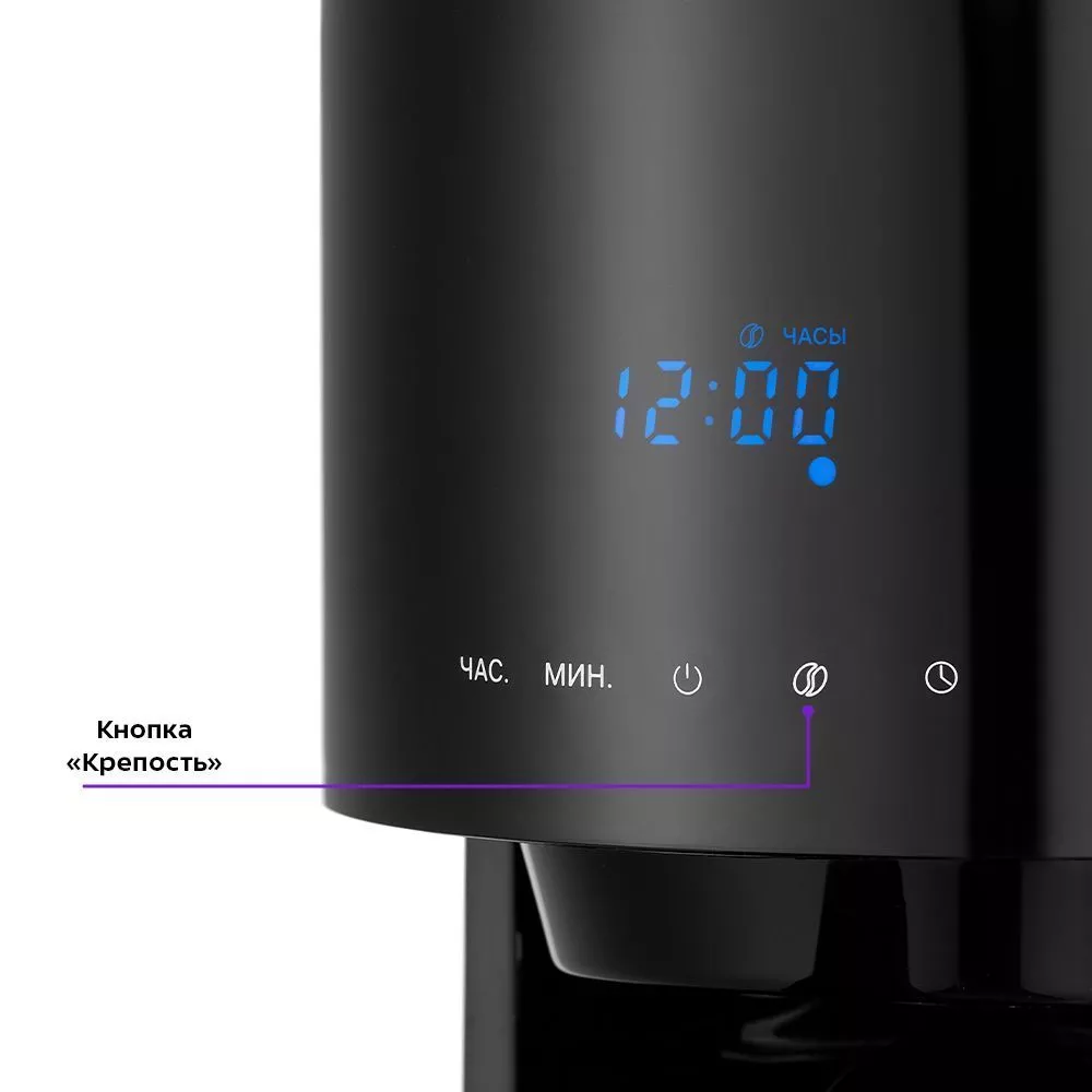 На дисплее отображается выбранный режим, а также текущее время или время подогрева. Крепость кофе можно регулировать кнопкой на панели управления. Чем более крепкий кофе выбран, тем больше индикаторов «Крепость» будет гореть над временем.