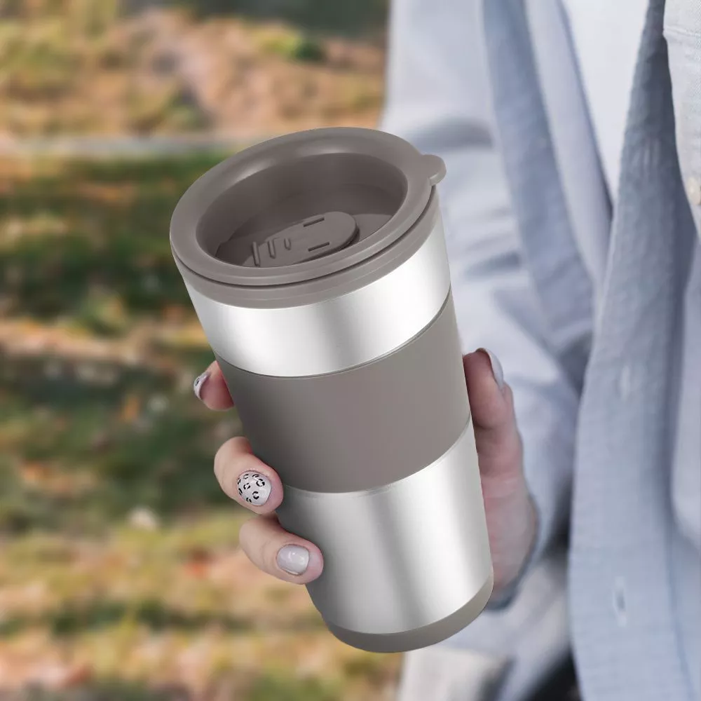 Термокружка выполнена из пластика и нержавеющей стали с силиконовой вставкой, которая не даёт вам обжечься. Крышка термокружки позволяет пить кофе на ходу, благодаря удобной форме отверстия для питья, которое можно закрывать.