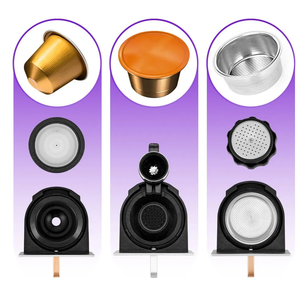 Благодаря 3 адаптерам, которые входят в комплект, кофеварка подходит для капсул типа Nespresso Original и Dolce Gusto, а также для молотого кофе. Она прекрасно совмещает в себе все преимущества каждого типа кофеварок и готовит под давлением 19 бар.