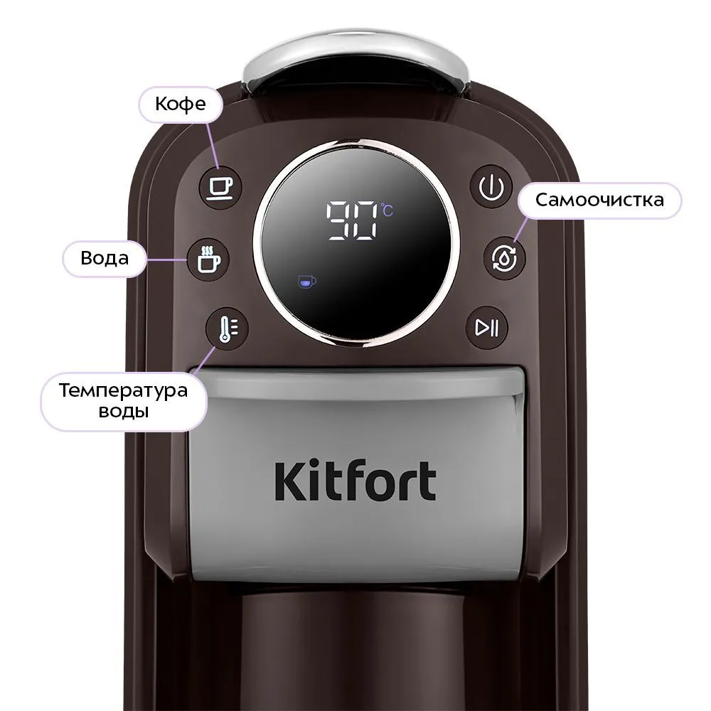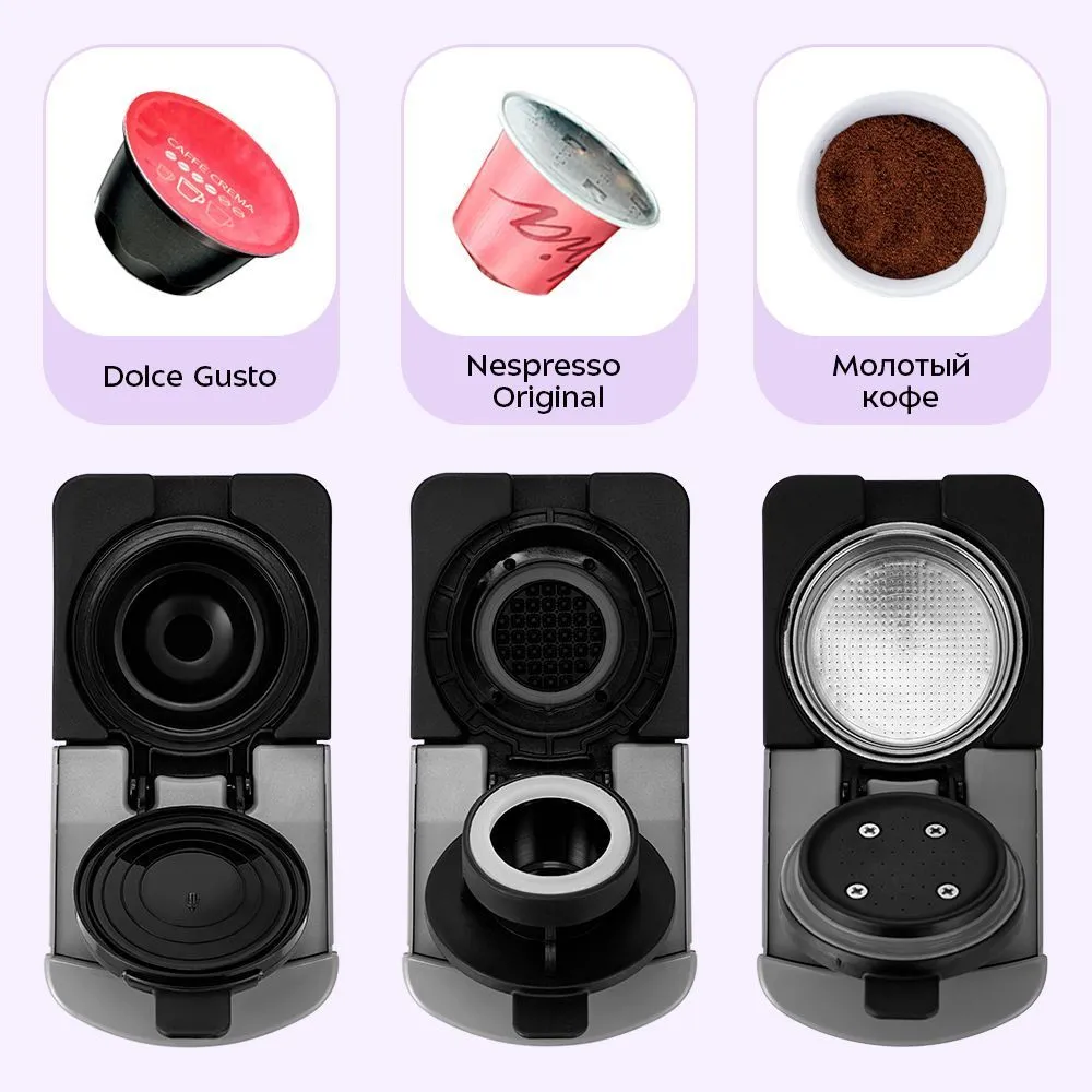 Кофеварка «3 в 1» КТ-7656 – многофункциональное устройство, сочетающее в себе функции капсульной и рожковой кофеварки. Она поможет приготовить эспрессо или лунго, а также множество других кофейных напитков на ваш вкус