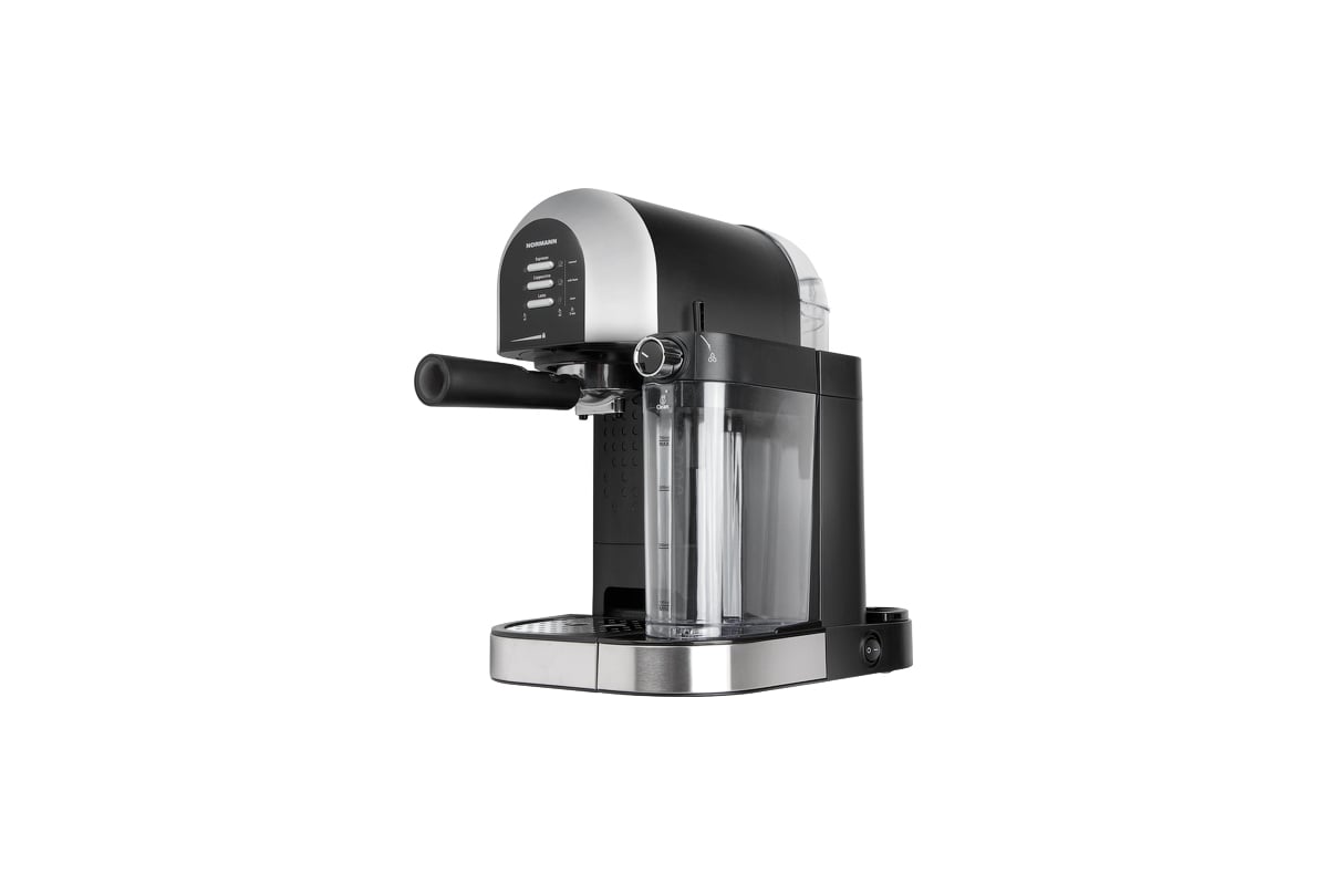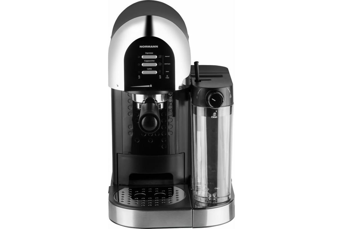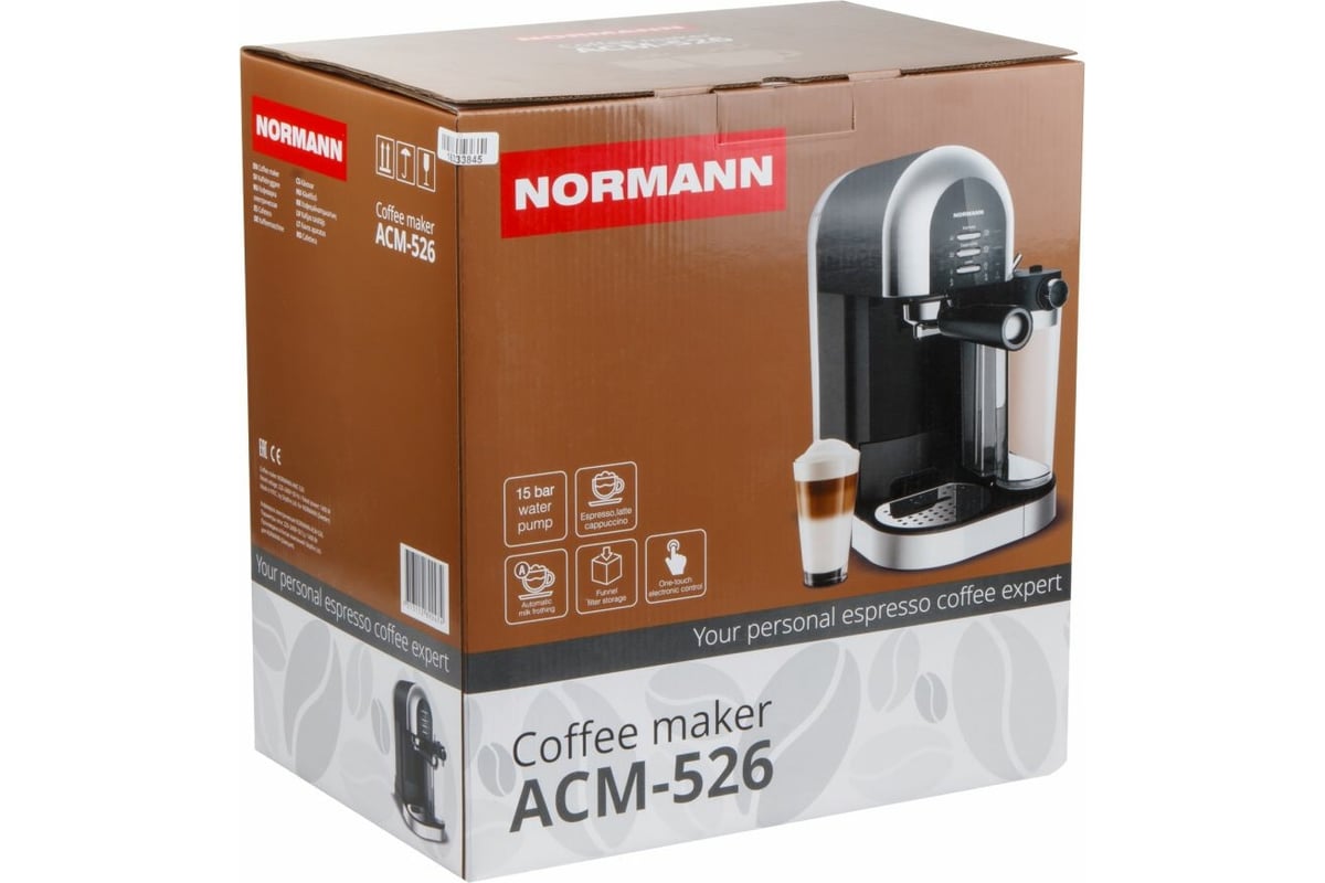 Кофеварка NORMANN ACM-526 – рожкового типа с электронным управлением – приготовление порции напитка в одно нажатие. Режимы: эспрессо (одна порция), эспрессо (двойная порция), капучино (маленькая порция), капучино (большая порция), латте (маленькая порция), латте (большая порция), ручной режим, приготовление молочной пены, режим очистки.