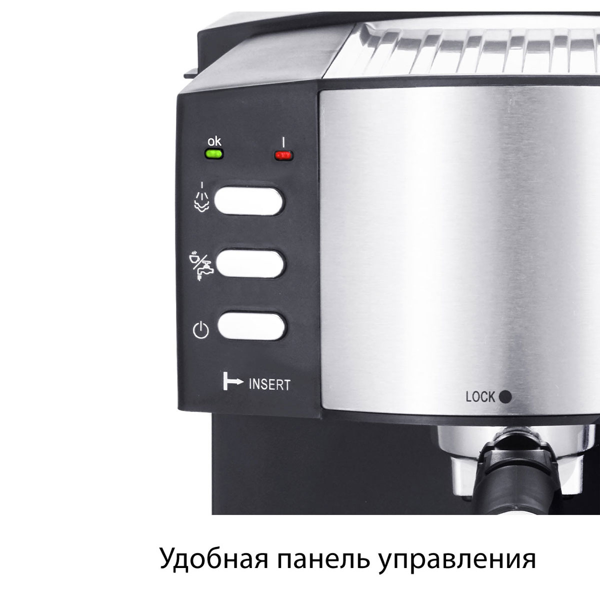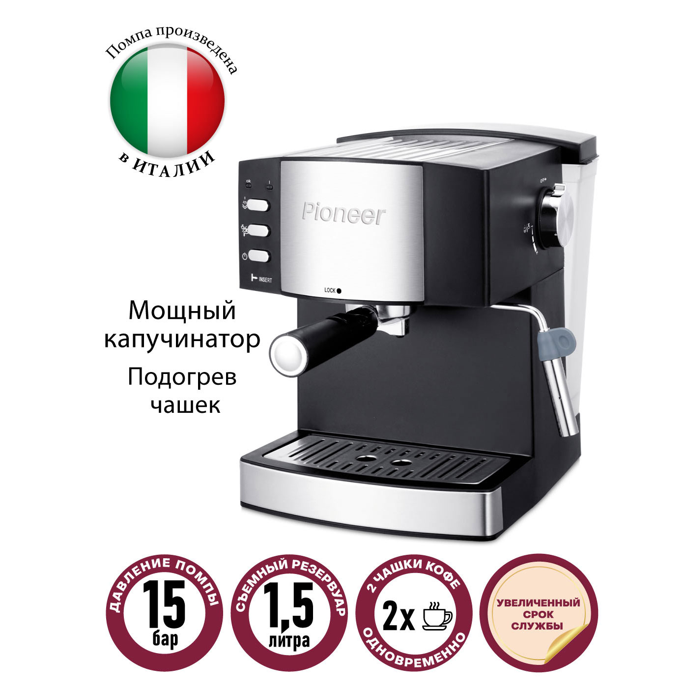 Кофеварка рожковая Pioneer CM111P мощностью 850 Вт с итальянской помпой ULKA, давлением 15 Бар и двойным фильтром из нержавеющей стали сохранит Ваши драгоценные утренние минуты и станет правильным выбором для дома или офиса. Данная модель предусматривает одновременную раздачу на 2 чашки. КЛЮЧЕВЫЕ ХАРАКТЕРИСТИКИ:Итальянская помпа ULKA; давление помпы 15 бар; загрузка молотого кофе; механическое управление. ОБЛАСТИ ПРИМЕНЕНИЯ: Приготовление эспрессо, лунго, ристретто, капучино, макиато, американо, латте. ОСОБЕННОСТИ И ПРЕИМУЩЕСТВА: мощность 850 Вт; объем съемного резервуара для воды: 1,5 л; мощный капучинатор с регулятором подачи пара; подача горячей воды; подогрев чашек; индикация готовности; рожок из металла; индикация питания, защита от перегрева и протекания; простота использования; легкая очистка. ОСНАЩЕНИЕ: капучинатор, рожок, мерная ложка-темпер, стальная платформа для подогрева чашек, двойной фильтр из нержавеющей стали, съемная решетка, съемный лоток для сбора капель.