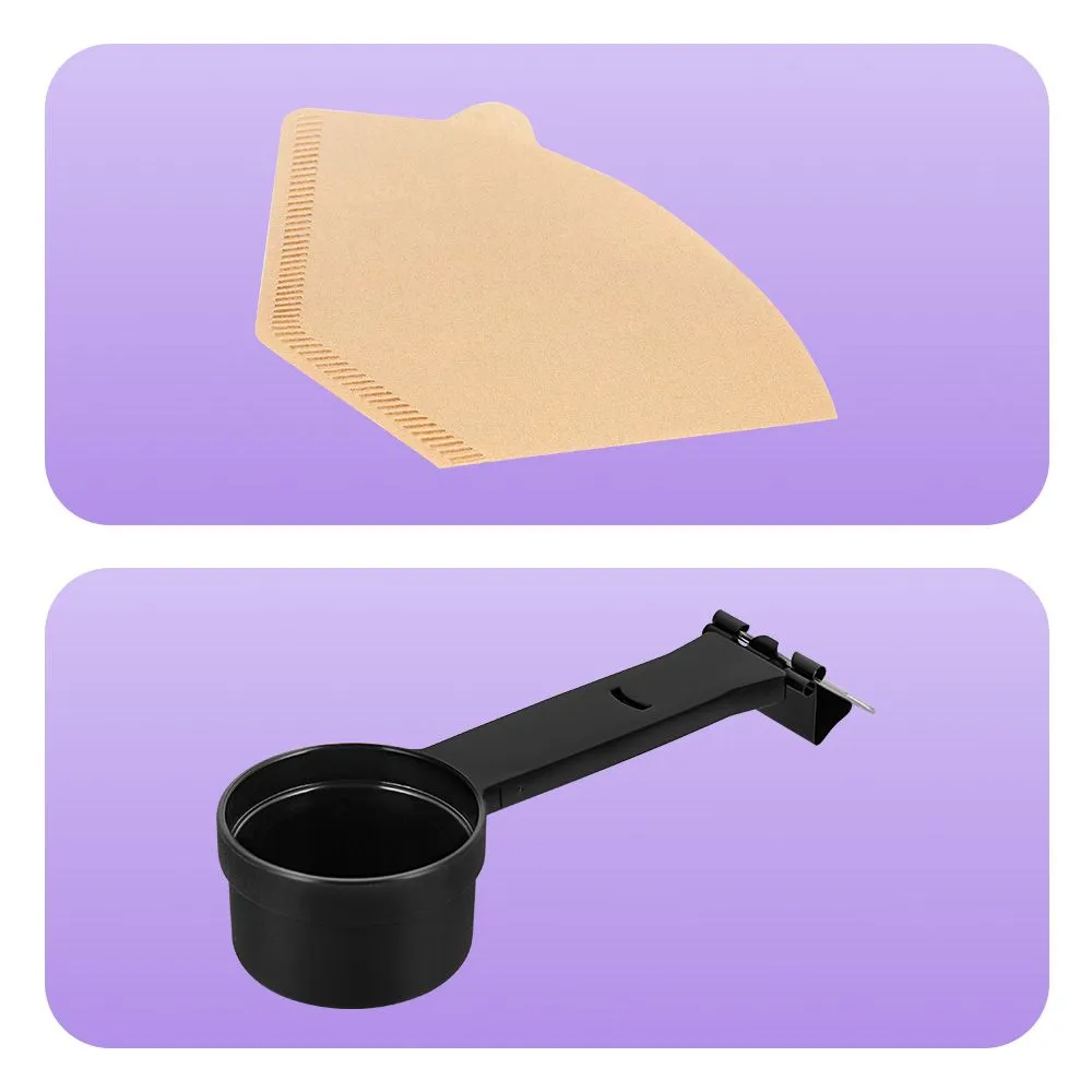 Мерная ложка вмещает 10 грамм молотого кофе. На другом конце мерной ложки установлена прищепка, которой вы можете закрыть пакет кофе. Одноразовые фильтры также уходят в комплект.