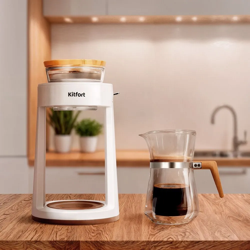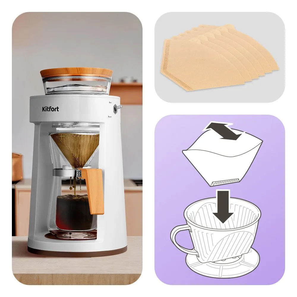 Портативная кофеварка—пуровер КТ-7573 готовит ароматный черный кофе из молотого кофе. Особенность данной кофеварки заключается в воронке для пуровера. Пользоваться прибором очень просто.