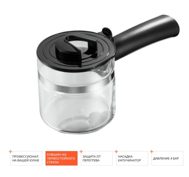 В комплектацию кофеварки входит кувшин, в который наливается готовый кофе. Объема кувшина 240 мл хватит, чтобы за один раз сварить 2-3 порции бодрящего напитка.