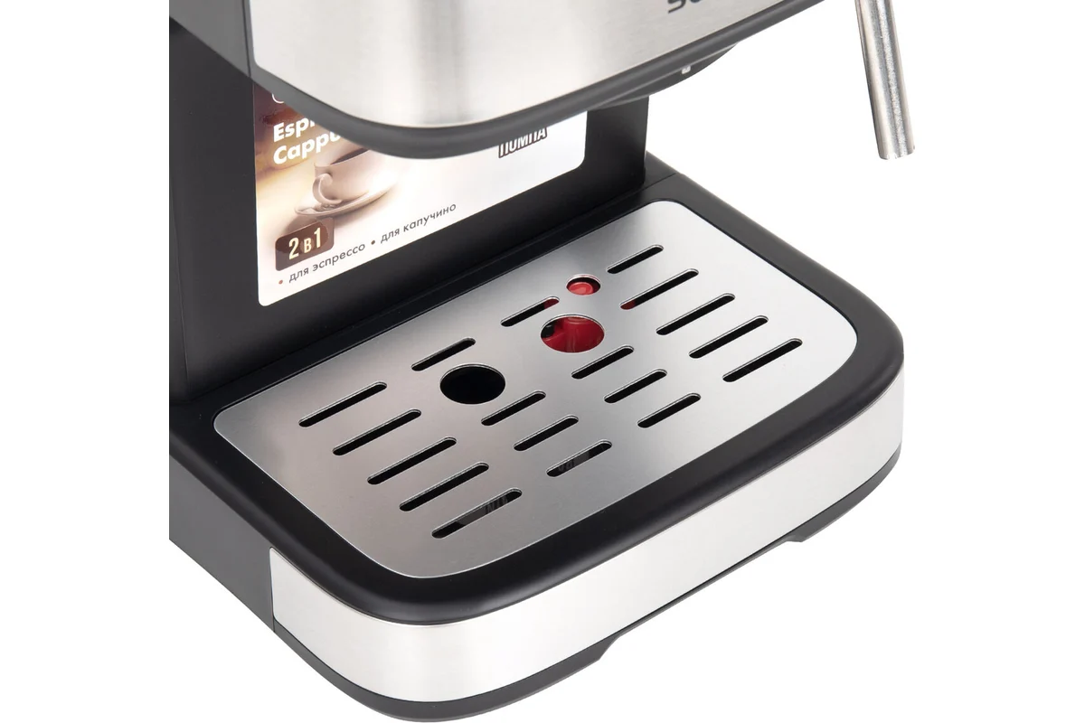 Кофеварка оборудована поддоном для сбора капель со съёмной решёткой из нержавеющей стали – его легко мыть и устанавливать обратно. В поддоне есть специальный поплавок: если он наполнится водой, поплавок поднимется выше решётки.