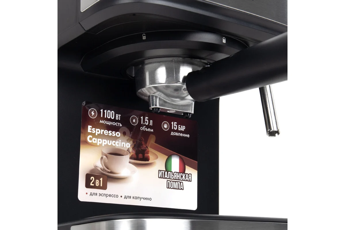 Кофеварка может одновременно приготовить две порции эспрессо – это удобно, когда нужно быстро сварить кофе к завтраку для себя и близких или угостить гостей ароматным напитком. Съёмный резервуар для воды объёмом 1,5 литра легко наполнять и чистить.