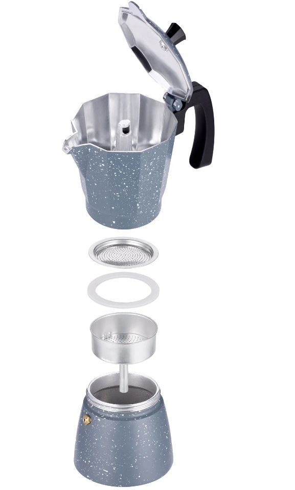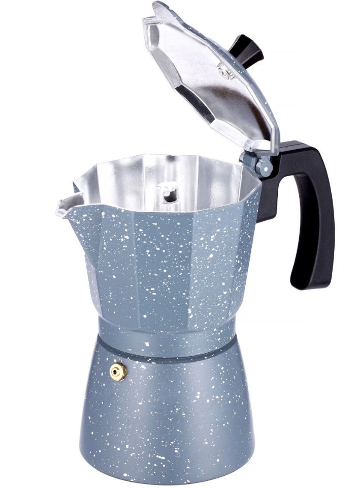 Современная гейзерная кофеварка выполнена из высококачественного алюминия, имеет удобную ручку, которая не нагревается.