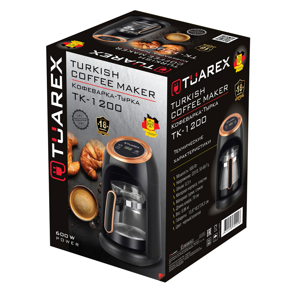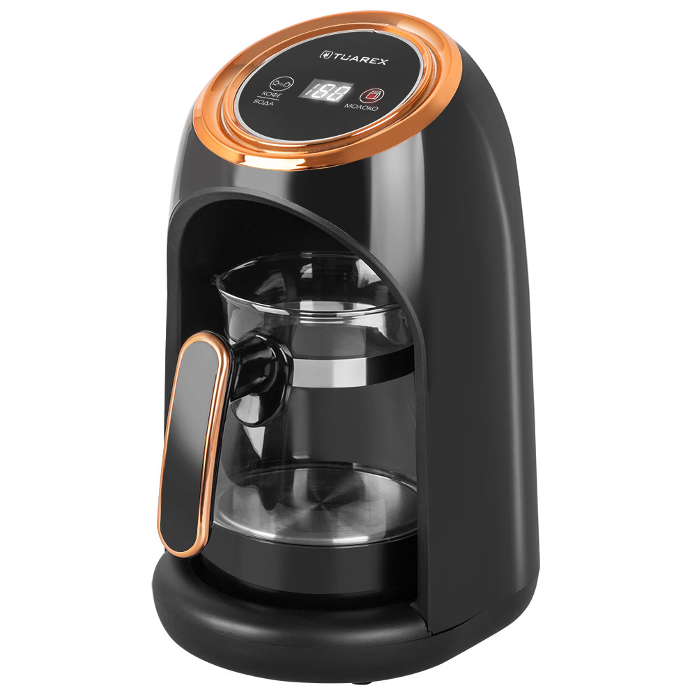 Для молотого кофе, Нагревательный элемент из нержавеющей стали, LCD дисплей, Можно использовать для кипячения воды и подогрева молока, приготовления какао или горячего шоколада, Материал турки: стекло, Приготовление от 1 до 4 порций, Автоматическое приготовление кофе