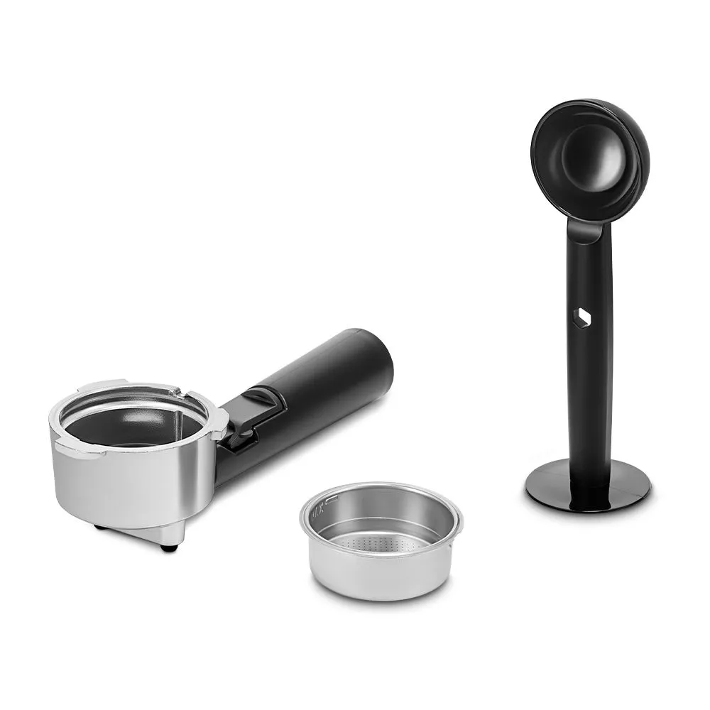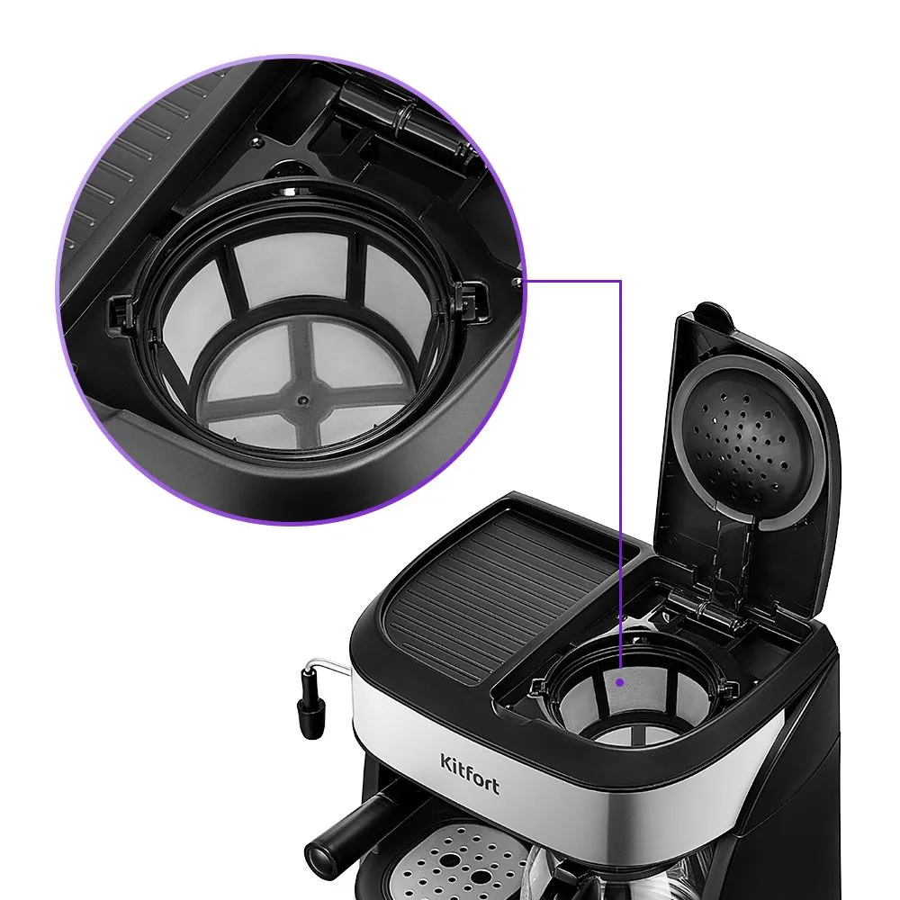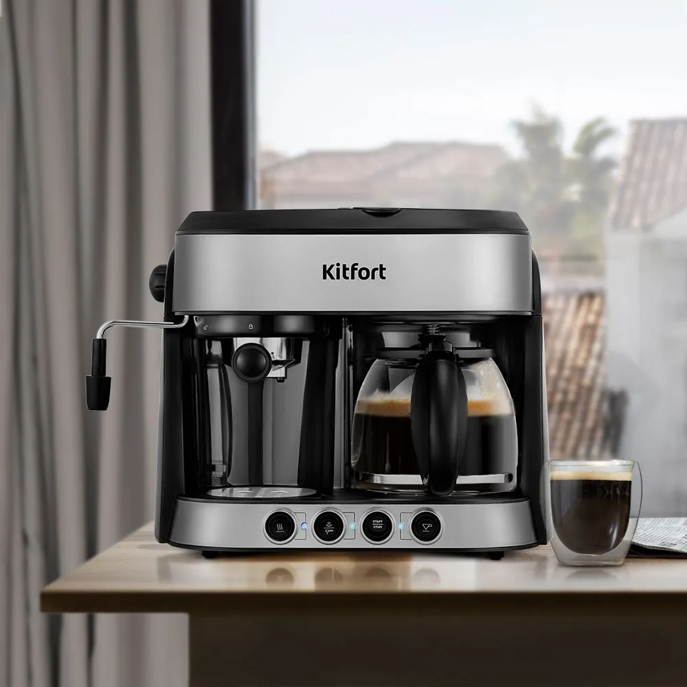 Кофейная станция Kitfort KT-7185 совмещает в себе два вида кофеварок: рожковая и капельная.