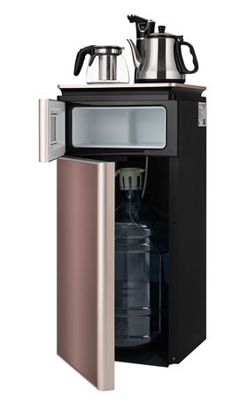 В состав кулера входит заварочный и электрический чайник. Аппарат оснащен сенсорной панелью управления, удобным краном подачи воды и шкафчиком для хранения. Яркая световая индикация и информативный дисплей на сенсорной панели сообщат о текущем температурном режиме и подключении к сети. Встроена защитная система от случайного нажатия и система подогрева заварного чайника, которая позволяет поддерживать температуру до 24 часов.