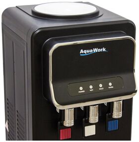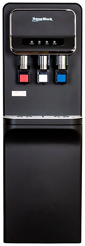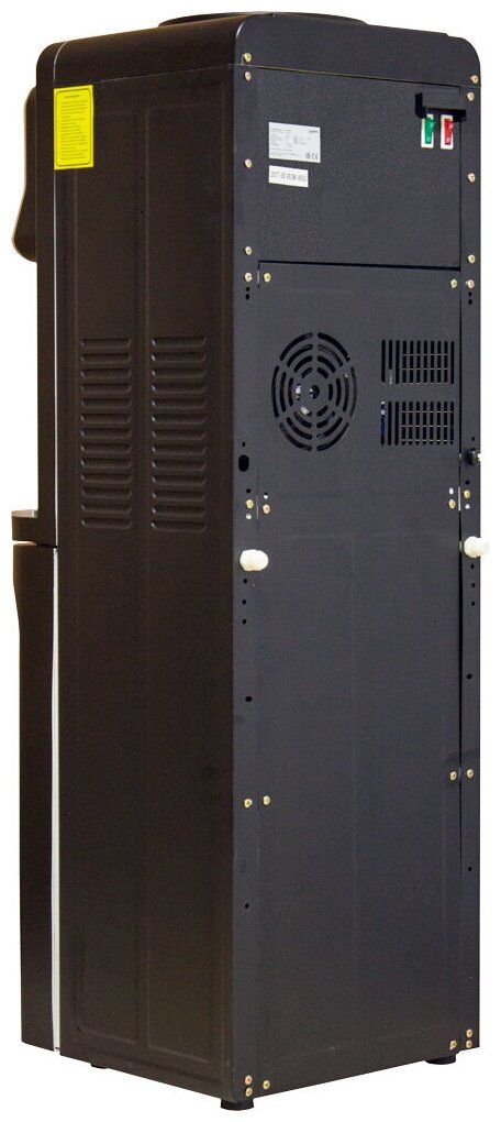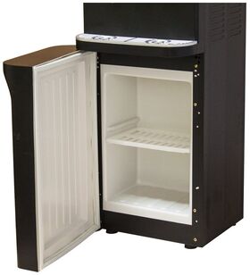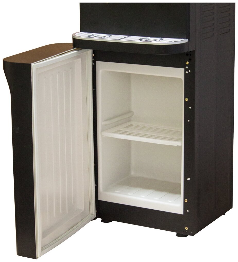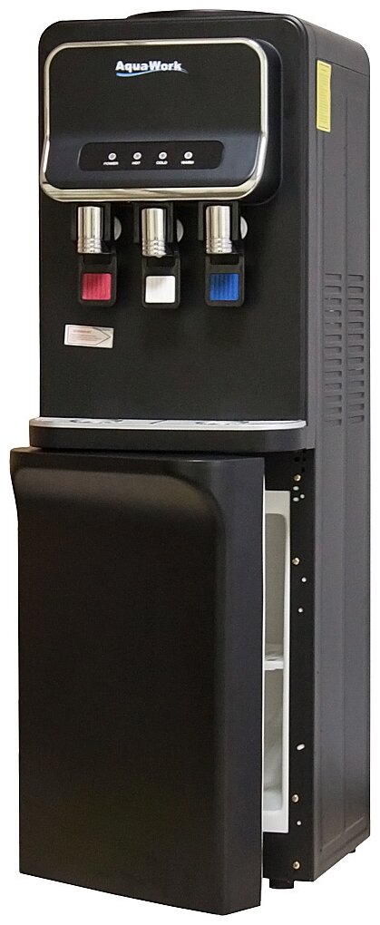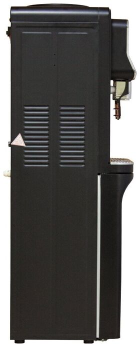 Напольный кулер для воды с нагревом, охлаждением электронного типа и небольшим шкафчиком в черном матовом корпусе из стали.