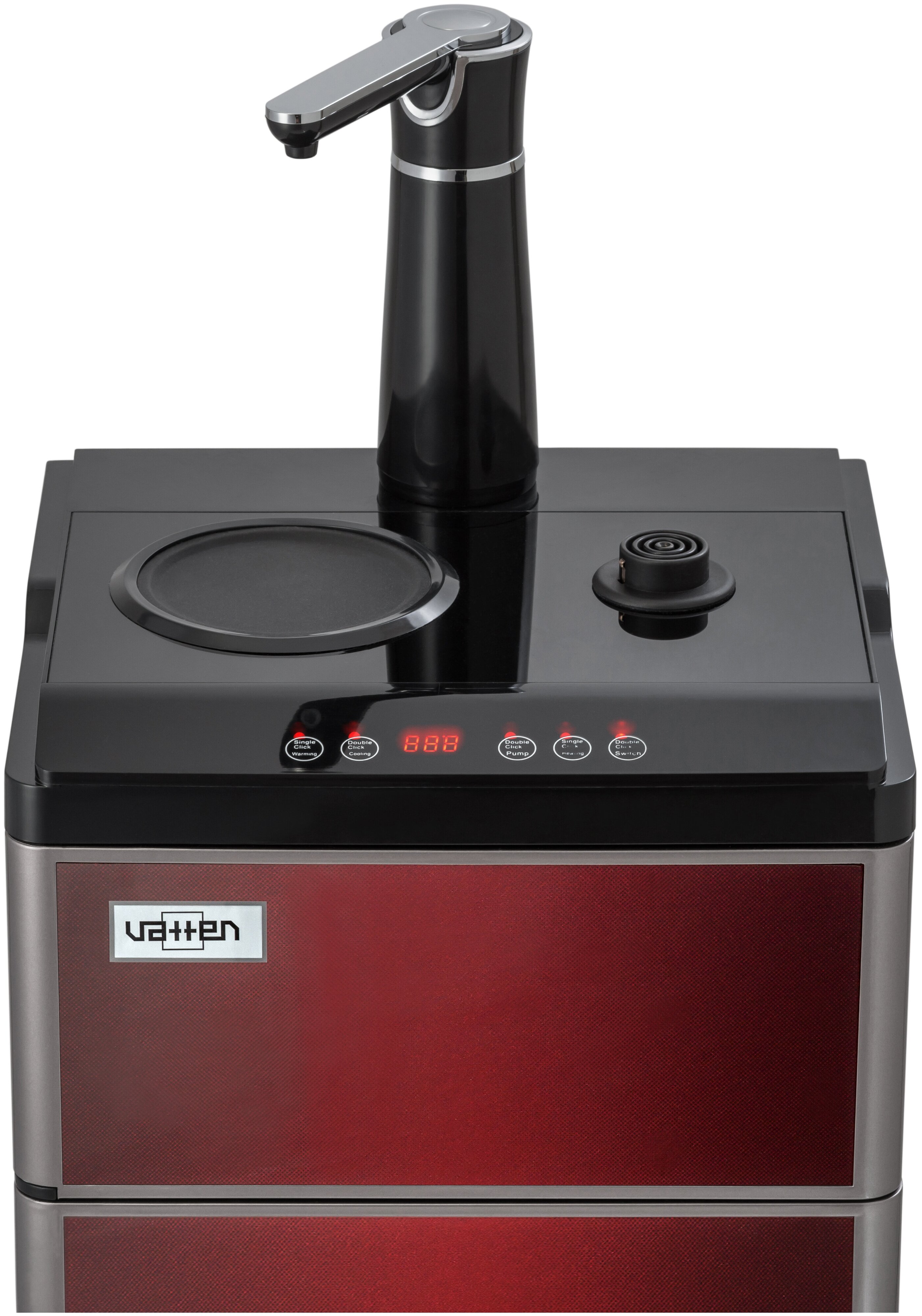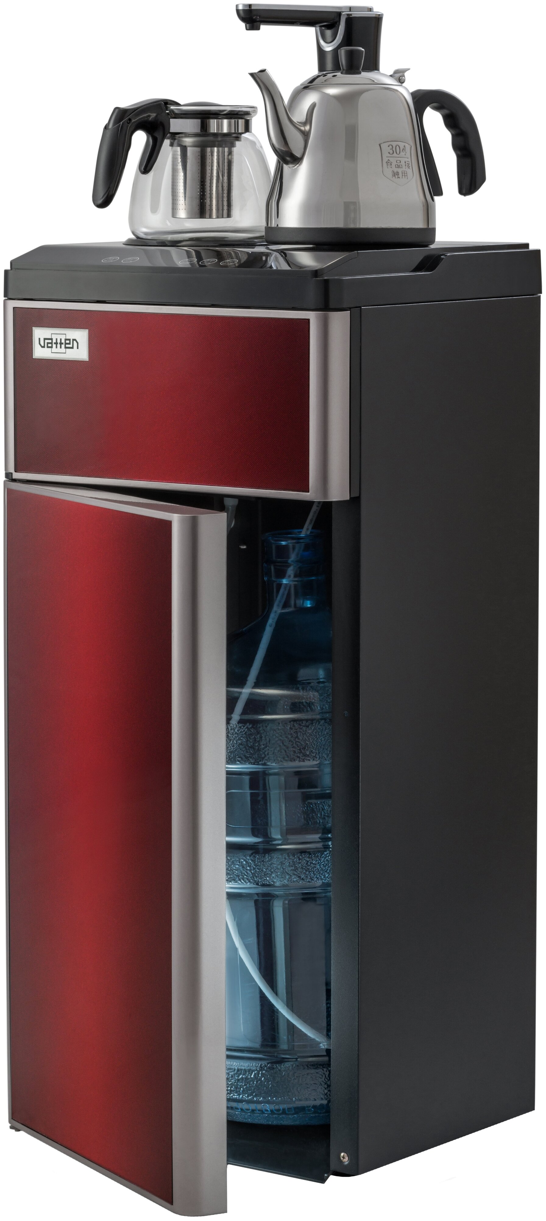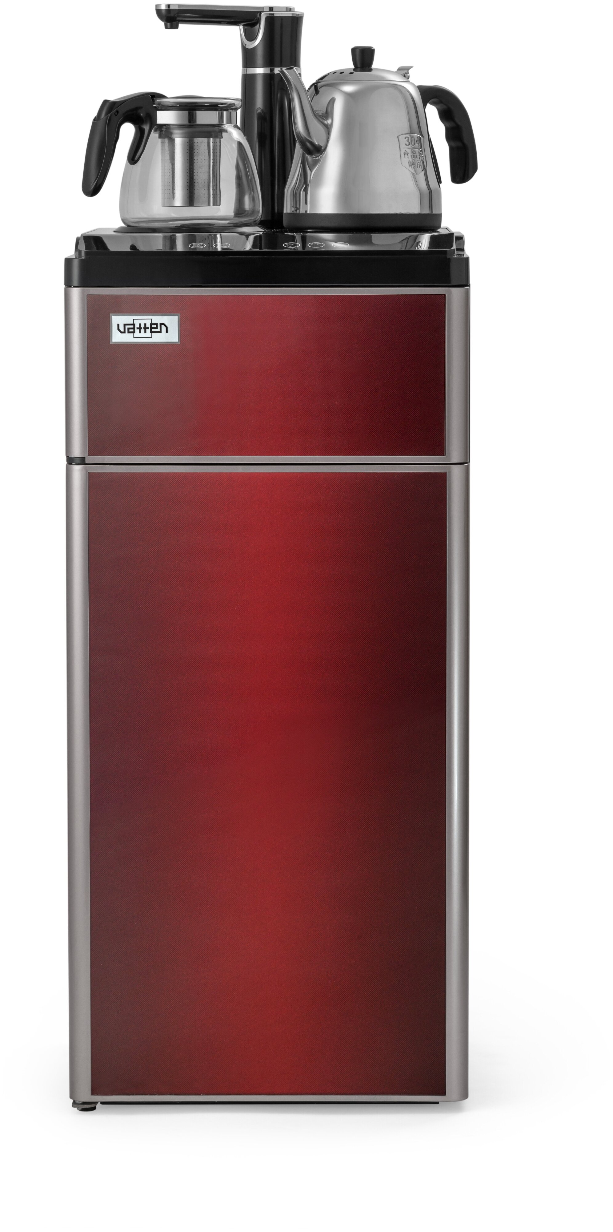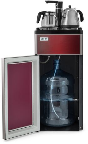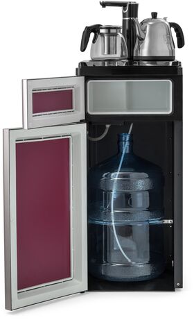 один кран для холодной и горячей воды (установлен в верхней части аппарата), сенсорная подача воды, оснащен двумя чайниками: для заварки чая и для кипячения воды