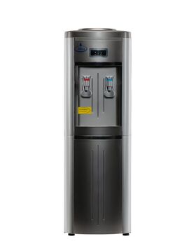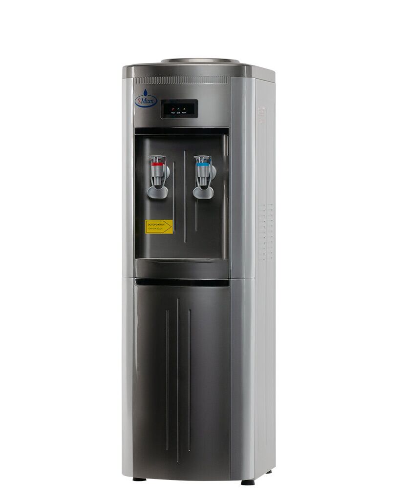 Кулер для воды SMixx 178 LD серебристо - серый - не классическая модель серебристо - серого цвета и шкафчиком (не холодильником) объёмом 16 л. Форма данной модели водного диспенсера с явно выраженными закруглёнными углами спереди. Сверху - три индикационные лампочки. Красная, зеленая и оранжевая. Лампочки - это своего рода индикация нагрева (красного цвета), охлаждения (зеленого цвета) и "спящий" режим - горит лампочка оранжевого цвета (когда нет подогрева воды). Нагрев воды осуществляется с помощью встроенного в бак ТЭНа (нагревательного элемента). С помощью термодатчика нагрева температура горячей воды поддерживается в диапазоне 85 - 90 °C. Объем бака нагрева составляет 1,2 литра, что позволяет за один раз набрать 2 - 3 стакана горячей воды. Подача воды осуществляется с помощью 2-х кранов. Тип подачи - нажим кружкой. Сзади предусмотрены 2 кнопки. Кнопка красного цвета отвечает за включение и выключения нагрева воды. Кнопка зеленого цвета - за включения и выключение системы охлаждения воды.