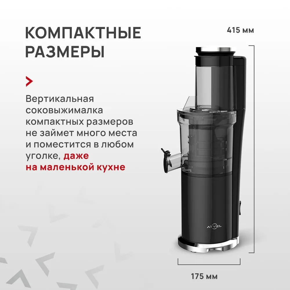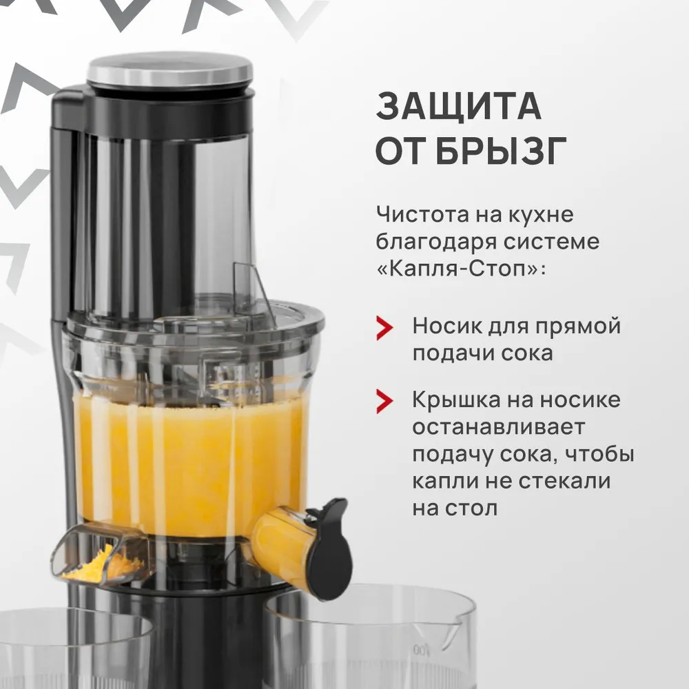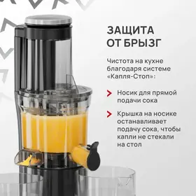 Конструкция соковыжималки: Противокапельная система, Увеличенная труба подачи, Прорезиненные ножки