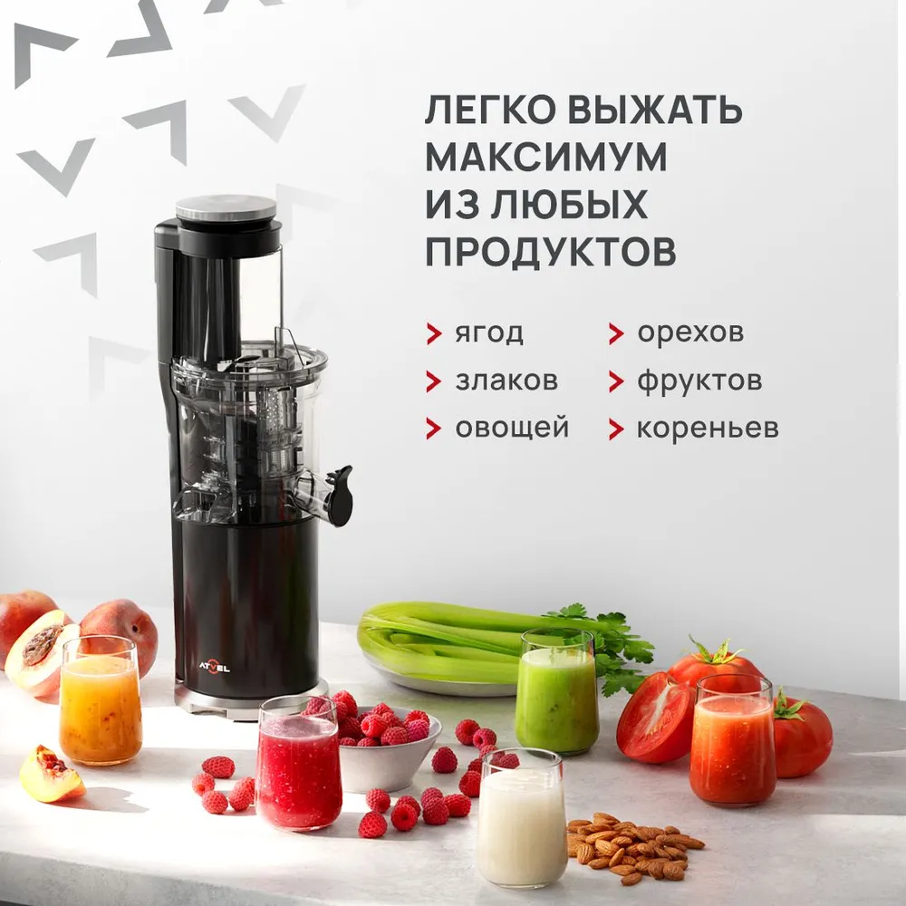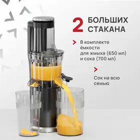 Особенности соковыжималки: Загрузка целых овощей и фруктов, Плавный запуск, Фильтрация сока