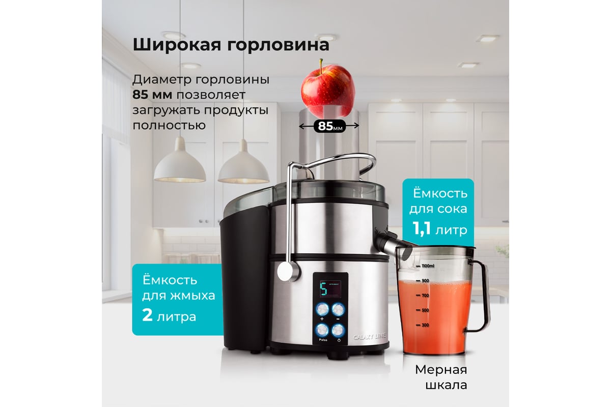 Откройте для себя мощь центробежной соковыжималки GALAXY LINE GL 0808 с производительностью 1500 Вт. Этот надежный прибор выполнен из прочной нержавеющей стали и оснащен мощным медным двигателем, который обеспечивает эффективную и быструю обработку фруктов и овощей. Широкая горловина диаметром 85 мм позволяет загружать целые фрукты без предварительной нарезки, что экономит ваше время и усилия.