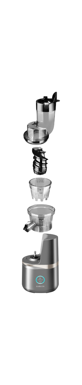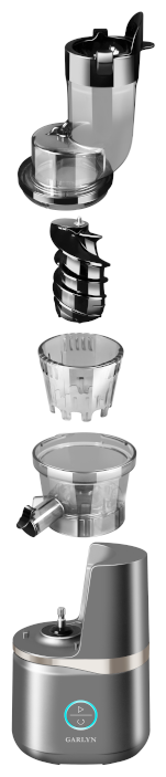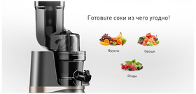 бессеточная фильтрация, загрузка плодов целиком; в комплекте: стакан для сока, стакан для жмыха, толкатель, щетка для чистки; количество шнеков: 1; резервуар для сока: стакан; максимальная скорость вращения: 70 об/мин; двойной толкатель; щеточка для чистки
