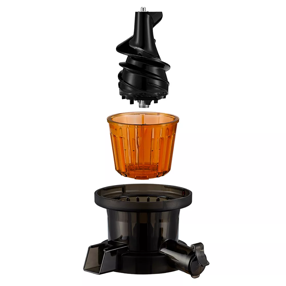 Спиралевидный шнек-пресс дробит и прессует продукт, а затем продавливает мякоть, которая поступает к нему через загрузочный лоток через фильтр, отделяя жмых от сока. Шнек отлит из ультрапрочного пластика, который хорошо выдерживает большие нагрузки.
