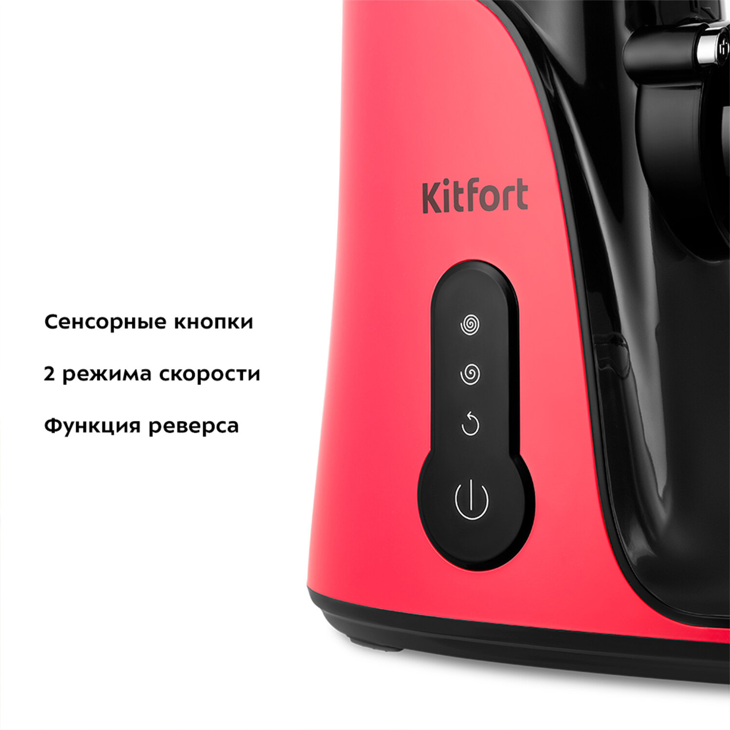 На боковой панели соковыжималки размещена сенсорная панель для включения/выключения, регулировки скорости, а также для включения реверса. Последняя функция упрощает процесс очистки шнека после отжима и облегчает извлечение остатков.
