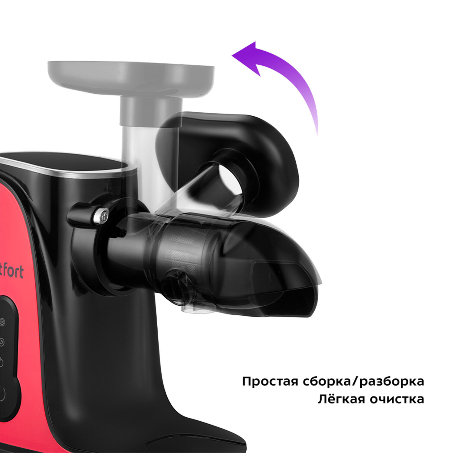 Принцип работы, как у мясорубки: шнек захватывает продукты, перемалывает, выдавливает сок и отделяет жмых. Шнек изготовлен из ультрапрочного пластика, который обладает высокой прочностью и способен выдерживать значительные нагрузки.