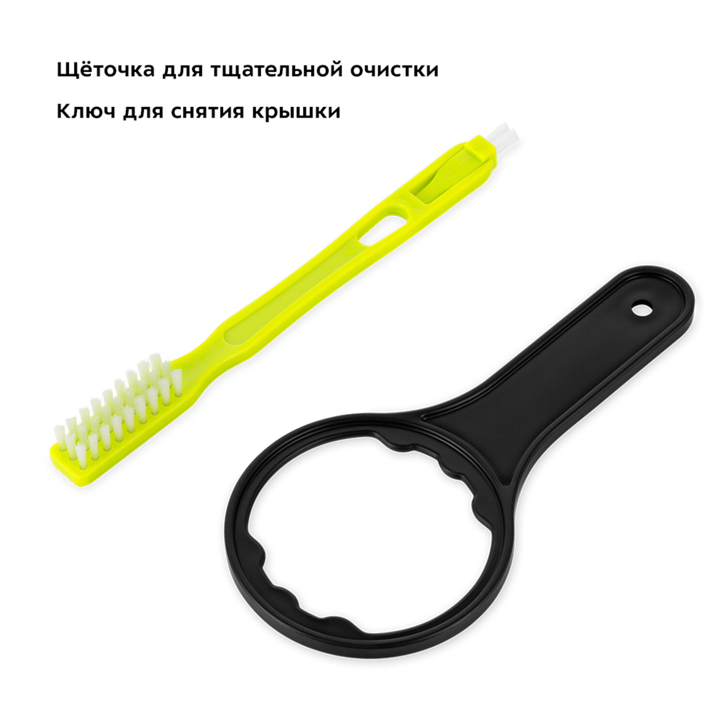 В комплекте имеется удобная щёточка для удаления остатков мякоти из сетки фильтра. Если крышку для выхода сока и жмыха будет трудно открутить после использования, в комплекте есть специальный ключ.