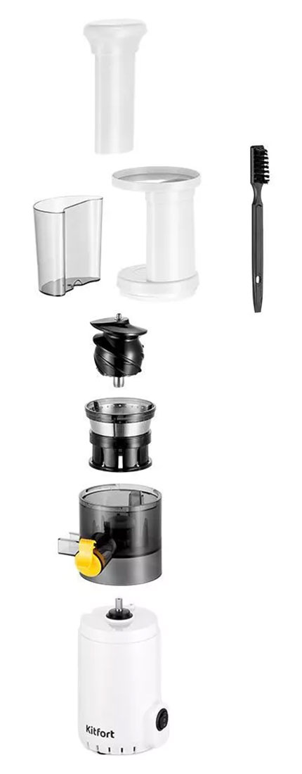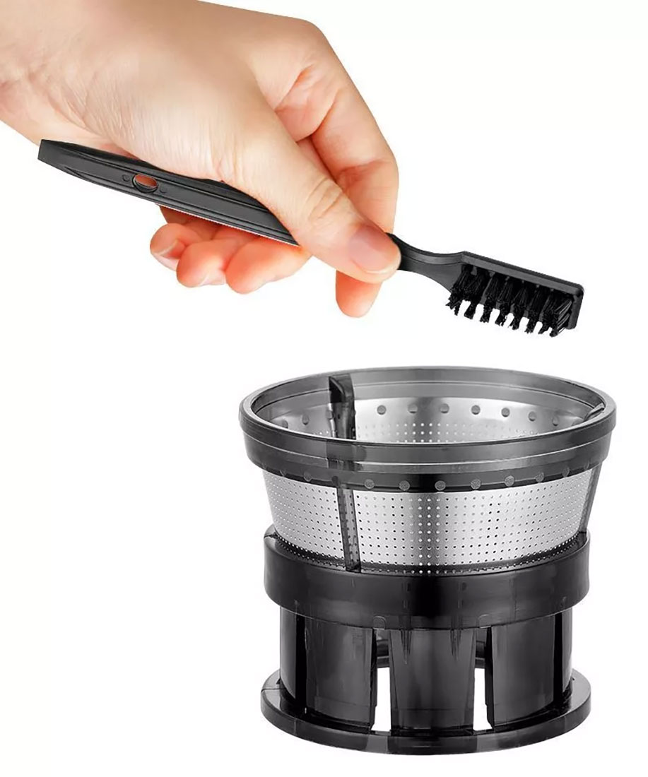 - Фильтр, через который проходит сок, сделан из нержавеющей стали и пластмассы, что делает его прочным и не подверженным коррозии. Для мытья фильтра в комплекте прилагается щётка, помогающая вычистить остатки мякоти.