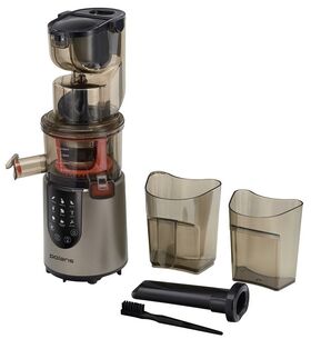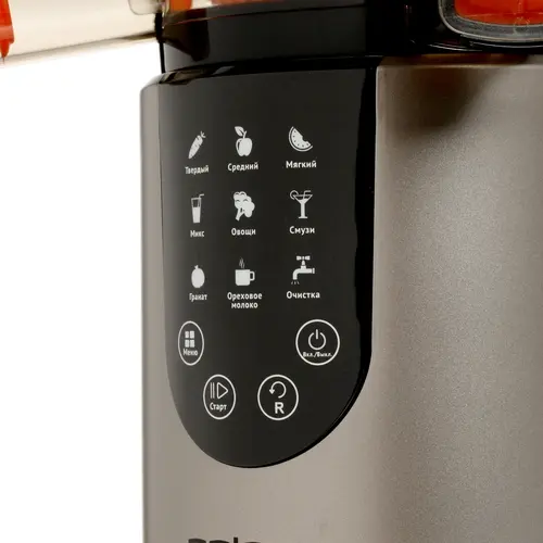 Есть отсек для мякоти объемом 800 мл, резервуар для сока объемом 1 л. Отсутствует импульсный режим, но это компенсируется наличием девяти скоростей, что позволяет подобрать подходящий вариант для определенного продукта. В набор дополнительно входит щетка для чистки.
