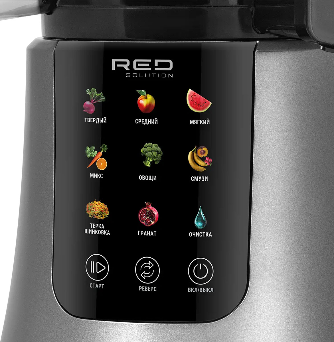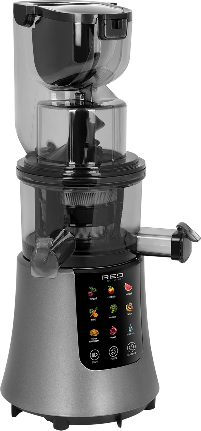 Шнековая соковыжималка RED SOLUTION J950 — мощный многофункциональный прибор, предназначен не только для быстрого отжима сока из овощей и фруктов, но и для шинковки продуктов.