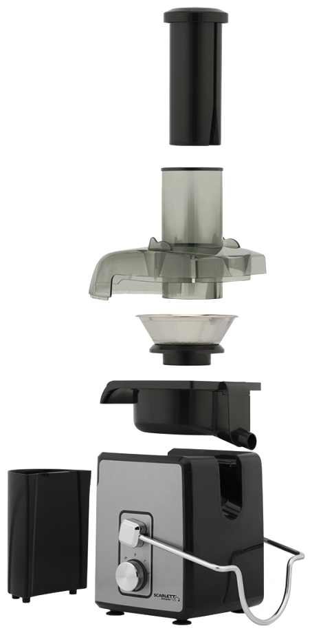 резервуар для сока: стакан; материал сетки: нерж. сталь; максимальная скорость вращения: 15000 об/мин; щеточка для чистки