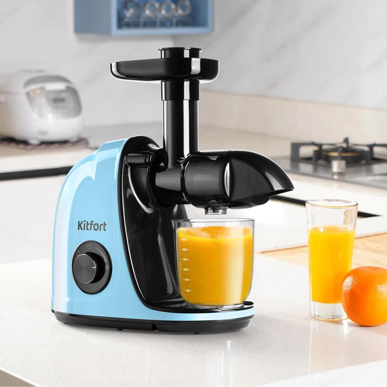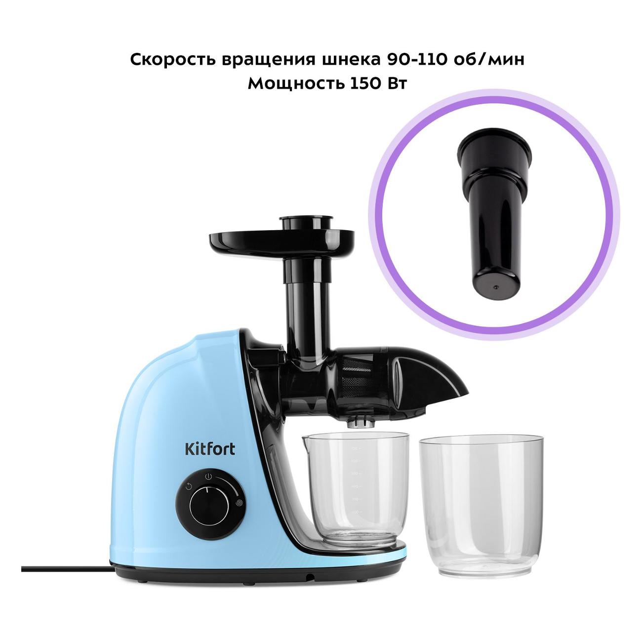 Шнековая соковыжималка Kitfort КТ-1146-5 оборудована механической панелью управления. Устройство функционирует с одной скоростью с максимальным показателем 110 об/мин. Предусмотрено наличие функции реверса. Потребляемая мощность составляет 150 Вт, длина сетевого шнура — 0,9 м.