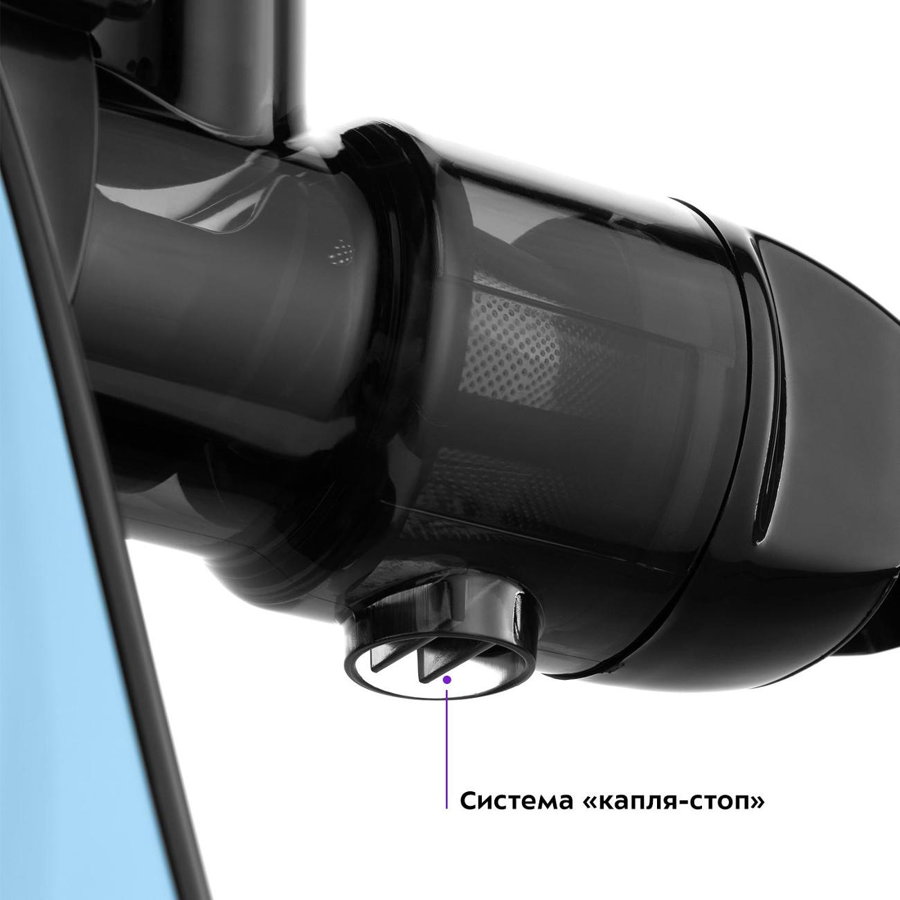 Конструкция устройства включает в себя съемный резервуар для сбора мякоти объемом 1,35 л и резервуар для готового сока объемом 700 мл. Пластиковый корпус оснащен прорезиненными ножками, отсеком для шнура и фильтром из нержавеющей стали. О готовности к работе оповещает специальный индикатор. За безопасную эксплуатацию отвечает функция отключения при перегреве. В комплект входят щетка для чистки и толкатель. Устройство выполнено в голубом цвете. Габаритные размеры — 38х37х16,5 см, вес — 3,43 кг.