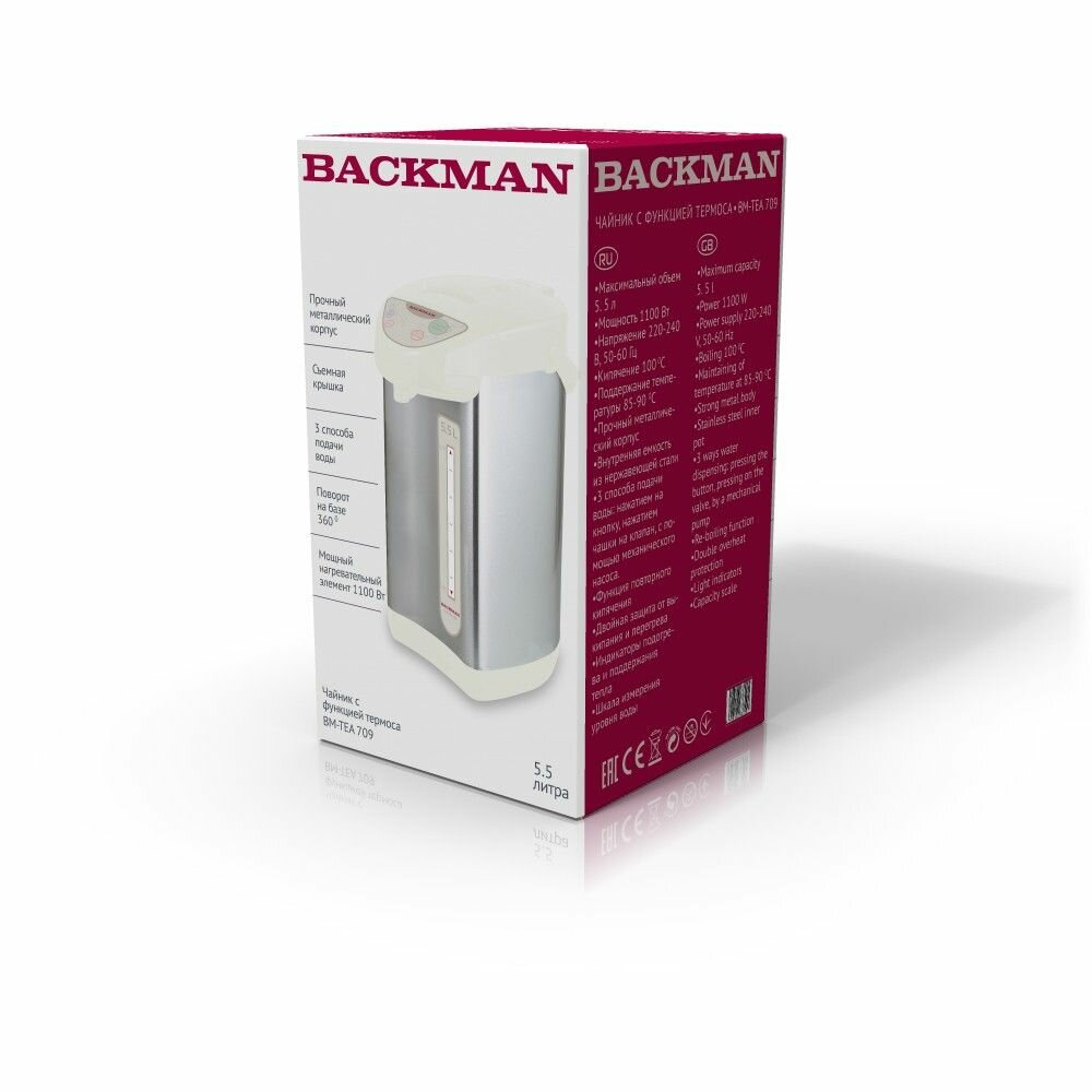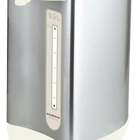 Чайник с функцией термоса BACKMAN BM-TEA 709 5,5 л, Чайник с функцией термоса, 1100 Вт, объем 5,5 л, металлический корпус, внутренняя ёмкость из нержавеющей стали, возможность вращения чайника на 360 °C, 3 способа подачи воды, поддержание температуры 85-90 °C, закрытый нагревательный элемент, функция повторного кипячения, двойная защита от выкипания и перегрева, световой индикатор подогрева и поддержания тепла, шкала измерения уровня воды, съёмная крышка.