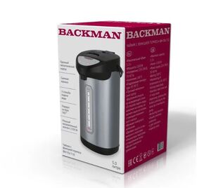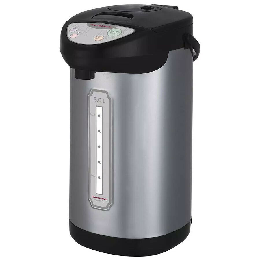 Чайник с функцией термоса BACKMAN BM-TEA 710 5,0 л, Чайник с функцией термоса, 1100 Вт, объем 5,0 л, металлический корпус, внутренняя ёмкость из нержавеющей стали, возможность вращения чайника на 360 °C, 3 способа подачи воды, поддержание температуры 85-90 °C, закрытый нагревательный элемент, функция повторного кипячения, двойная защита от выкипания и перегрева, световой индикатор подогрева и поддержания тепла, шкала измерения уровня воды, съёмная крышка.
