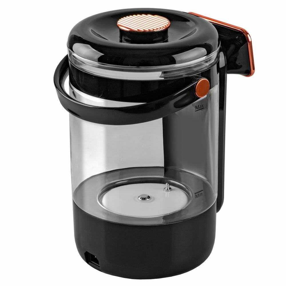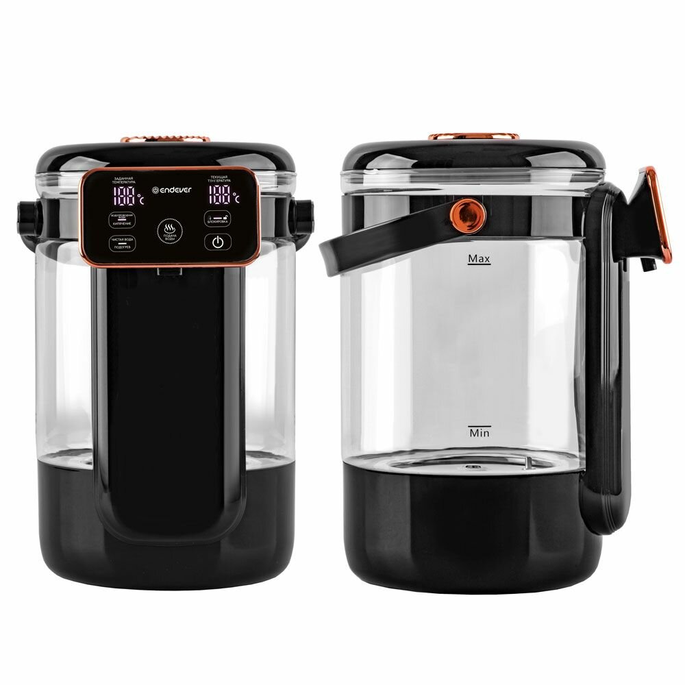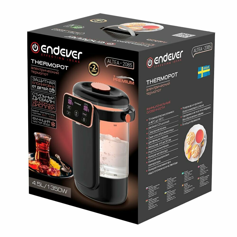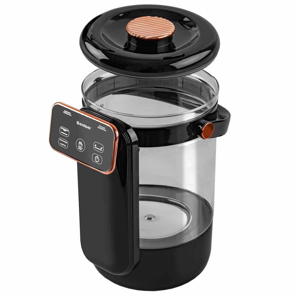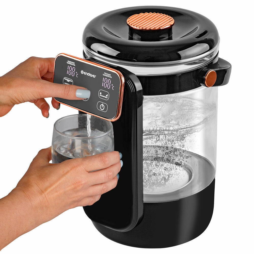 13 температурных режимов: от 40°С до 100°С, Двойной LCD-дисплей, Сенсорная панель, Один способ розлива воды, Две функции нагрева, Автоналив: от 5 до 30 сек, Индикация включения, Функция чистая вода, Функция поддержания температуры, Функция отключения при недостаточном количестве воды, Резервуар из прочного боросиликатного стекла, Керамическая пластина нагрева без образования накипи, Защитная блокировка от детей, Ручка для переноски