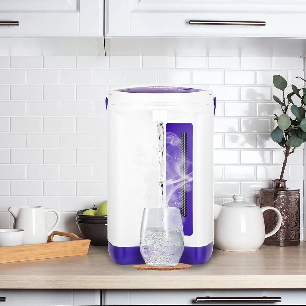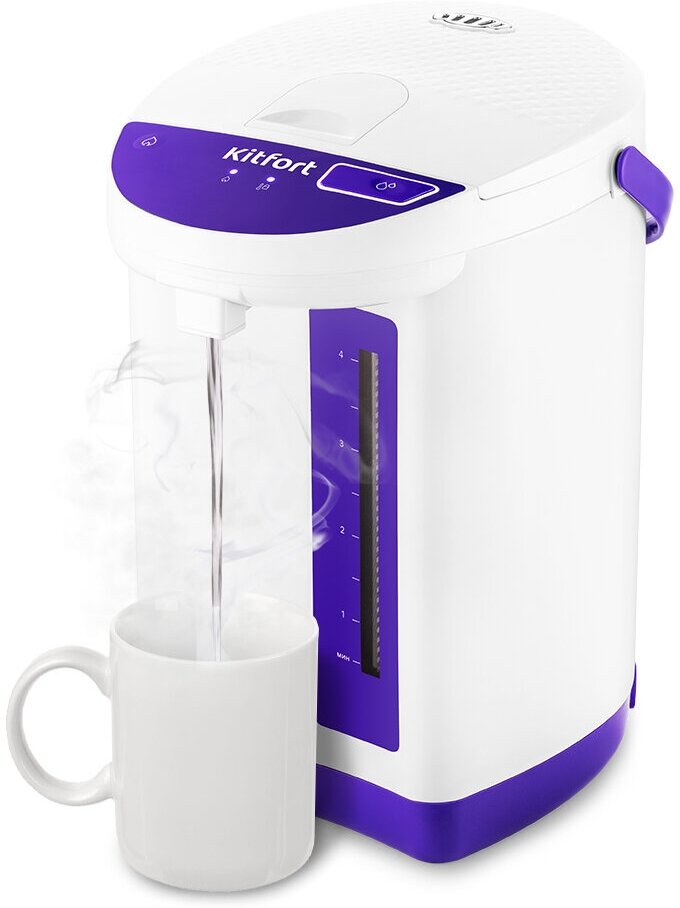 Термопот имеет двойные стенки и металлическую крышку. Это обеспечивает долгое сохранение тепла и экономию электроэнергии, а также исключает соприкосновение пластика с водой. Ёмкость резервуара 4,3 л, такого объёма хватит на 14 кружек чая ёмкостью 300 мл.
