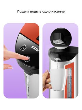 У термопота есть 2 режима подачи воды – механический, с помощью нажатия кнопки «Старт» и с помощью одной руки – вода будет наливаться, пока кружка нажимает на кнопку за носиком термопота. Для дополнительного кипячения есть отдельная кнопка на панели.