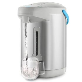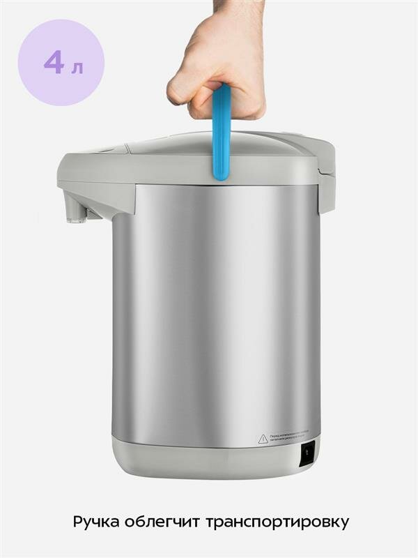 Ёмкость термопота составляет 4 литра - этого точно хватит на множество кружек чая! А чтобы его было легче переносить даже наполненным - в верхней части предусмотрена специальная ручка для переноски.